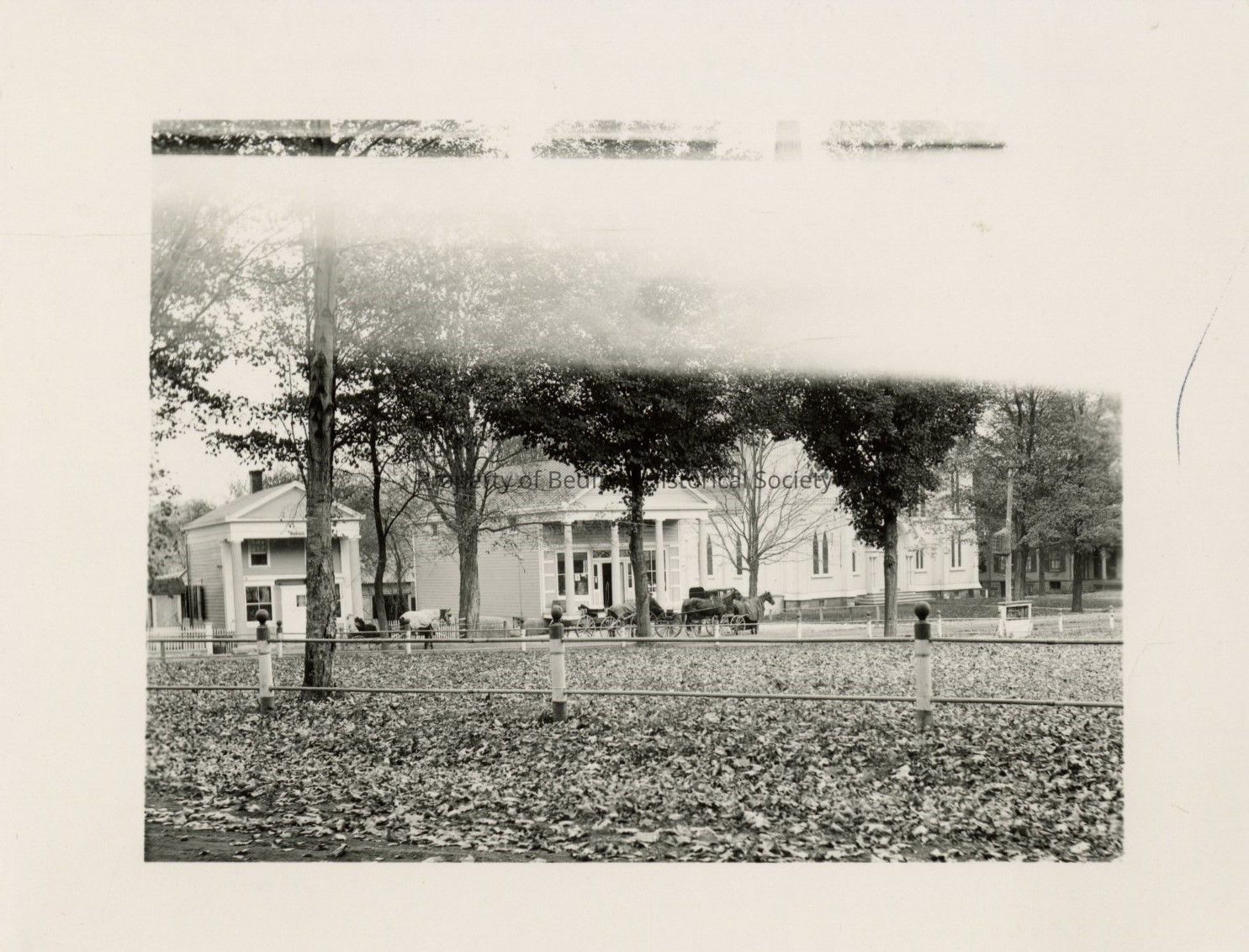 scanned photo of modern copy of village green photo. In background is post office, Lounsbery building and Presbyterian church.
