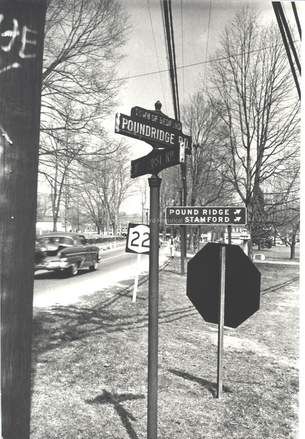 Village Green showing Road Signs at intersection of Rt 22 & 172 (Old Post Rd and Pound Ridge Road)