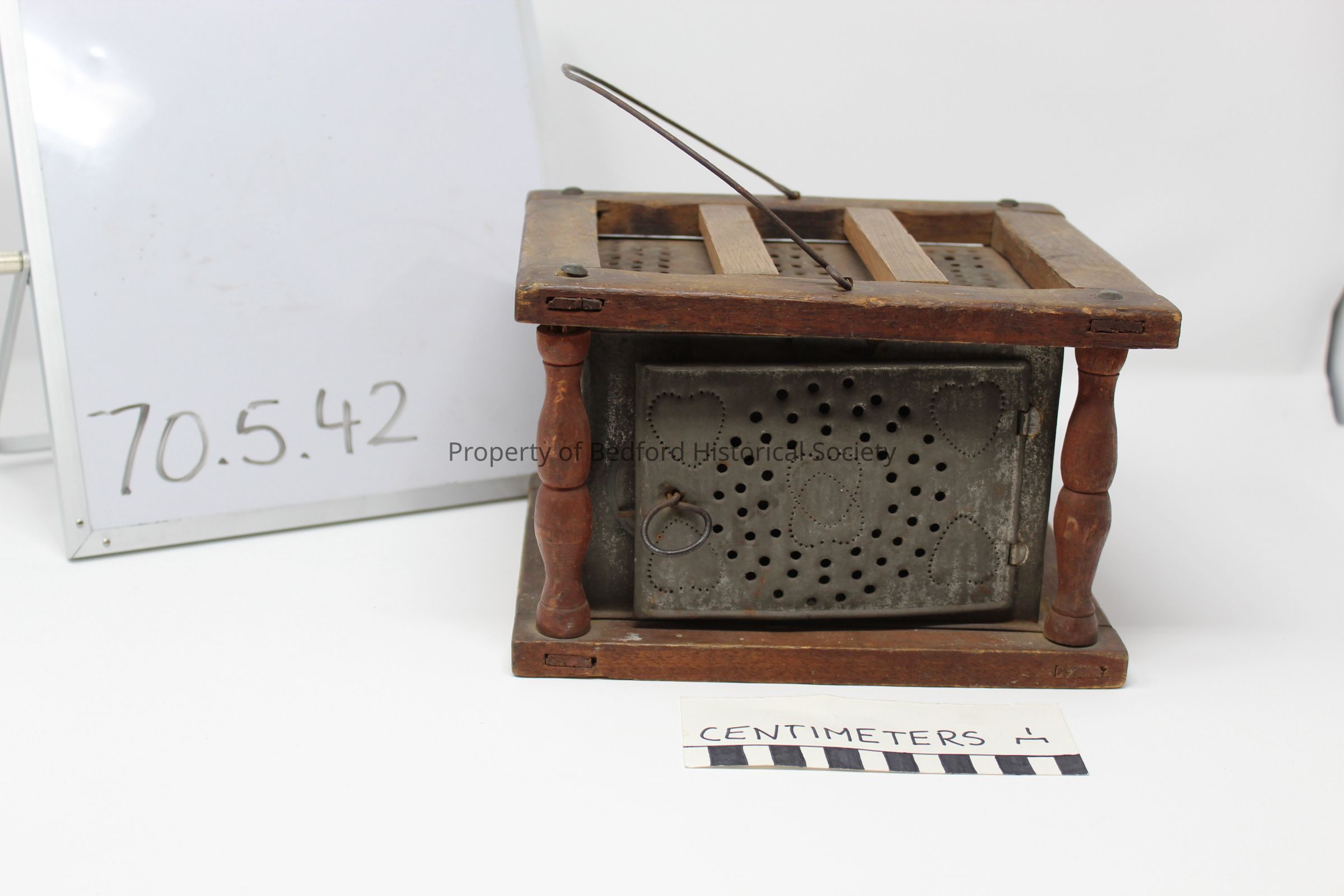 wooden and cast iron foot warmer, with pierced hearts decoration 9.5 L , 8" W