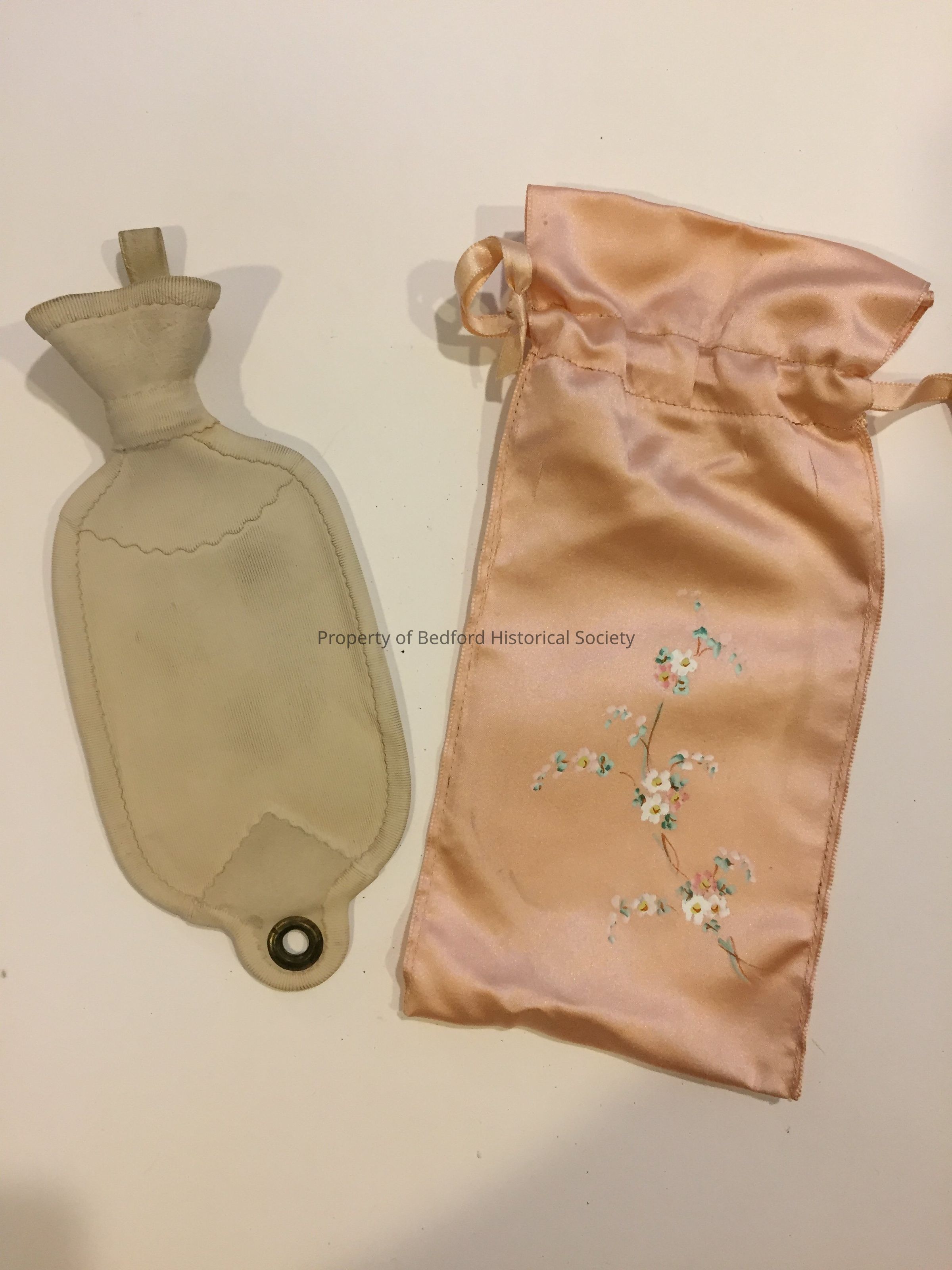 Child's hot water bottle with accompanying pink satin floral case. Found in historical hall attic