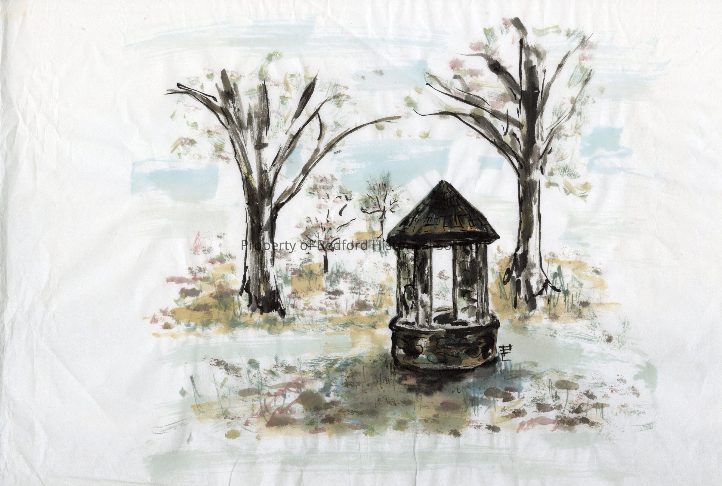 Watercolor on rice paper of Stone Well on School House Green possibly by Ryan Cioffari