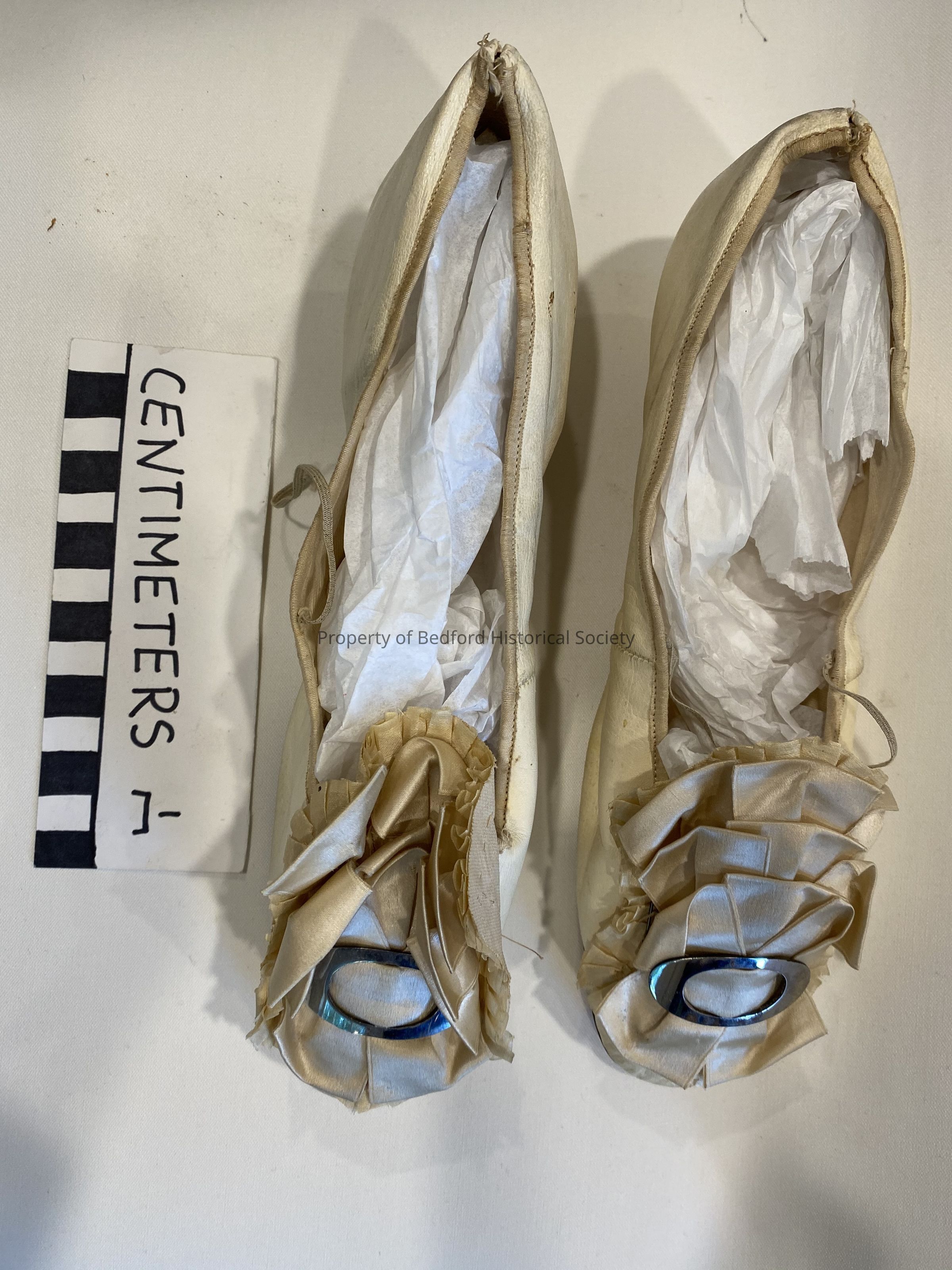 Pair of white leather woman's wedding shoes/slippers with Fenelon and metal buckle, having belonged to Mrs. Thomas E. Kirby (nee Isabella Catherine Town)