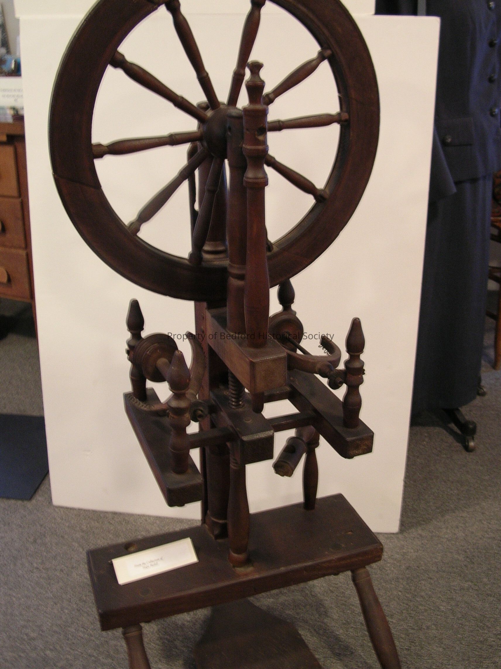 A dark stained, vertical, flax wheel, 44" tall. Used by the Israel Lyon family