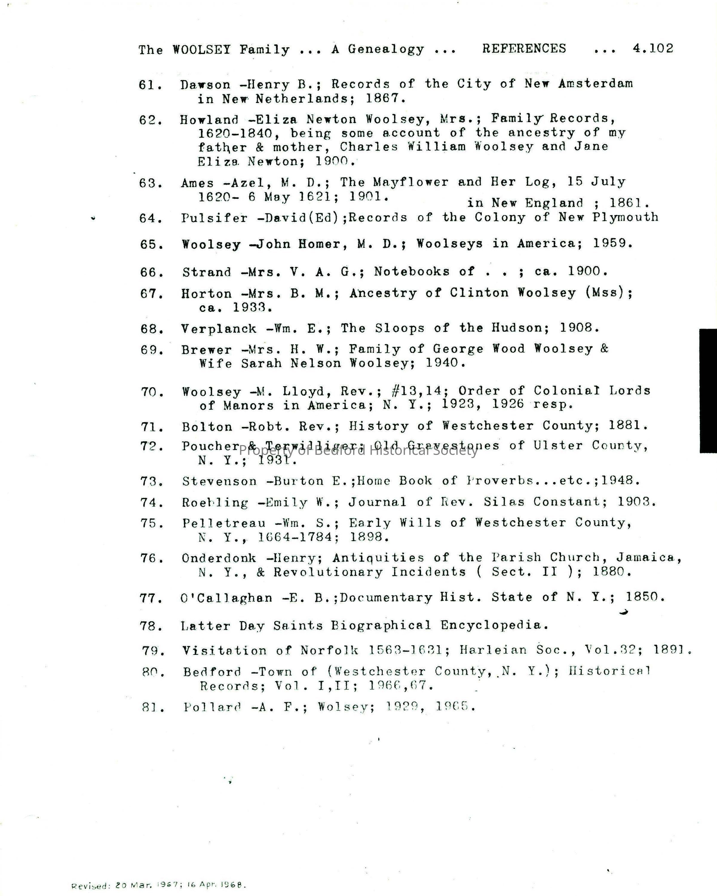 "Woolsey genealogy: Discard these sheets, for which revised pages have been substituted, after checking them against loose-leaf book. Some "revised" sheets supplied turned out to be duplicates; these have been kept in book, so a few duplicates will be found there"*