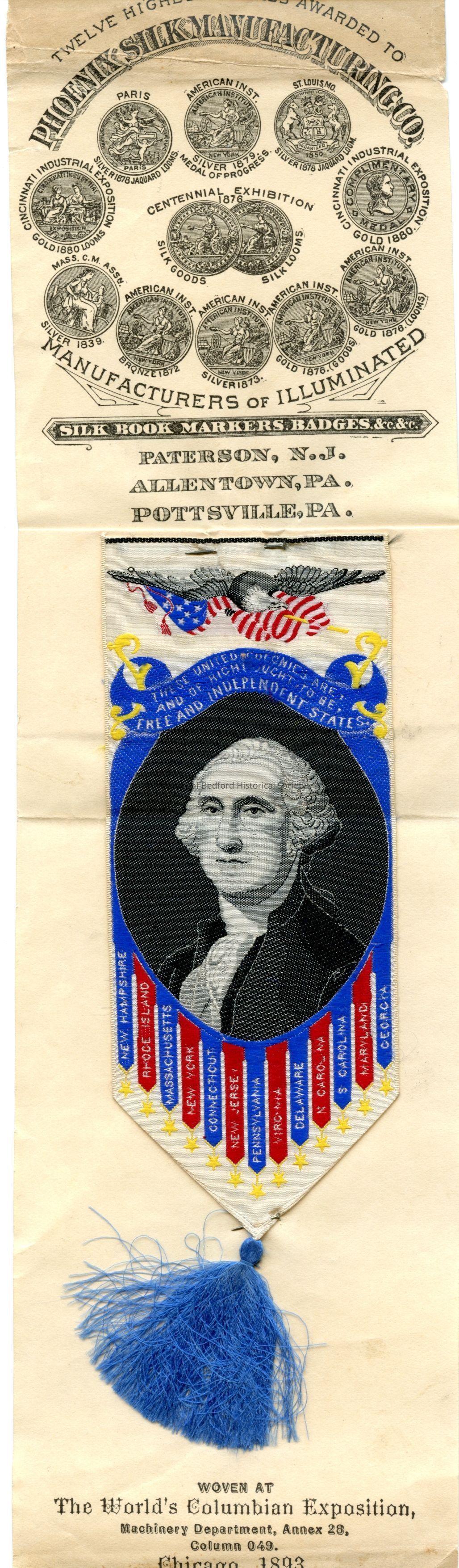 A silk ribbon with an image of George Washington and the original 13 colonies listed underneath. It is attached to a piece of paper that has the following informattion: