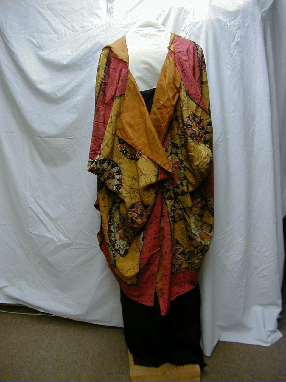 Crepe de chine with batik design of Pompeii red, ochre, and navy lined with curry crepe de chine and ending in point with tassel. Point forms a collar at the back of the neck.