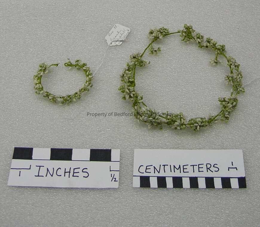 Headpiece and wristlet (for holding train), flowers made of tiny white and green shells