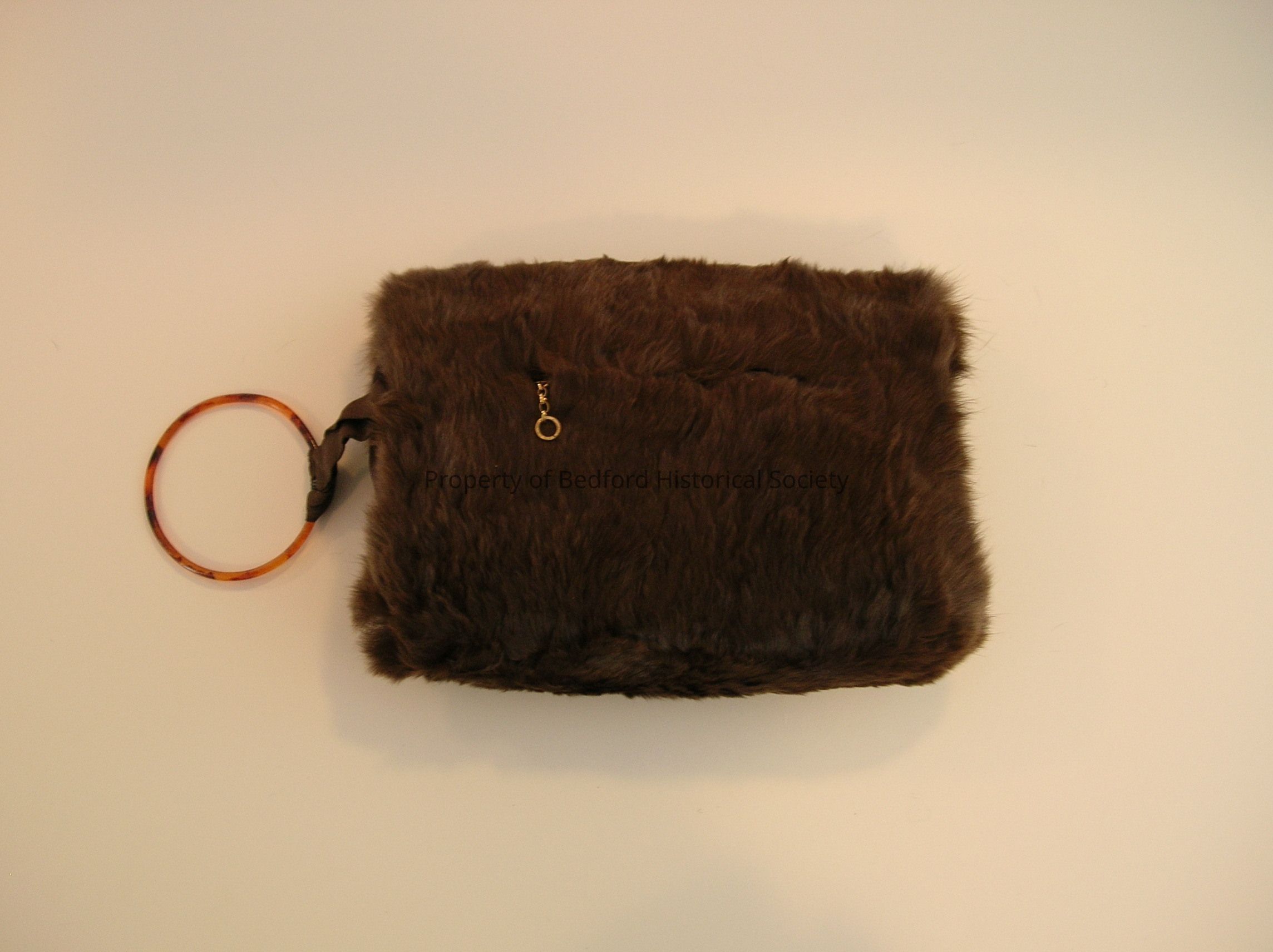 Brown fur muff. (Possibly rabbit fur) Zippered pocket on outside. Brown satin lining on inside and round wrist ring. Owned by Sally S. Cross. Given to her as a gift from her parents. Over 70 years old. Worn on Sundays for church for about 2-3 years.