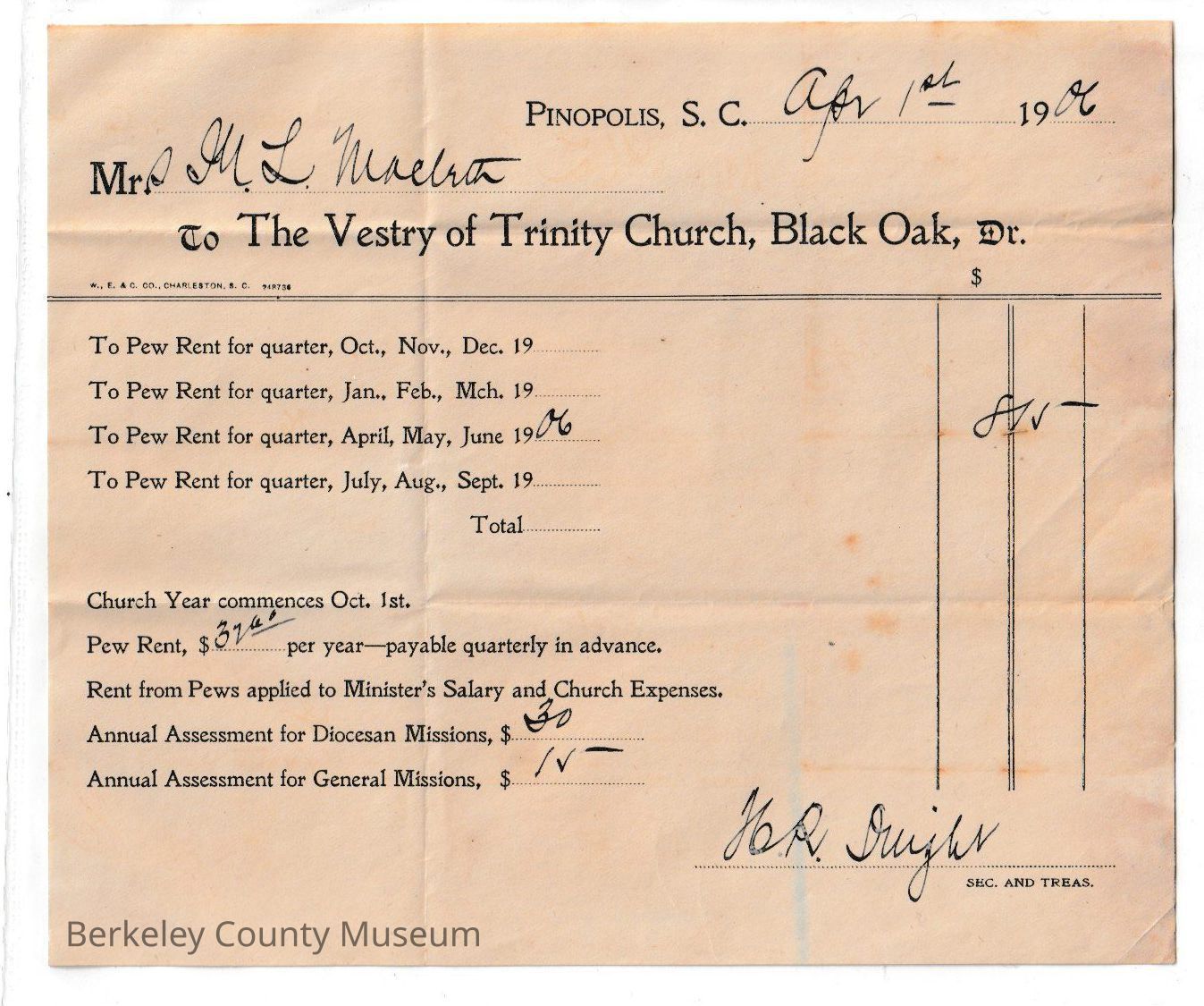 Pew rent receipt for Mrs. M.L. Macbeth at Trinity Church on Black Oak Dr. The church was destroyed in 1941 when the lake was made.