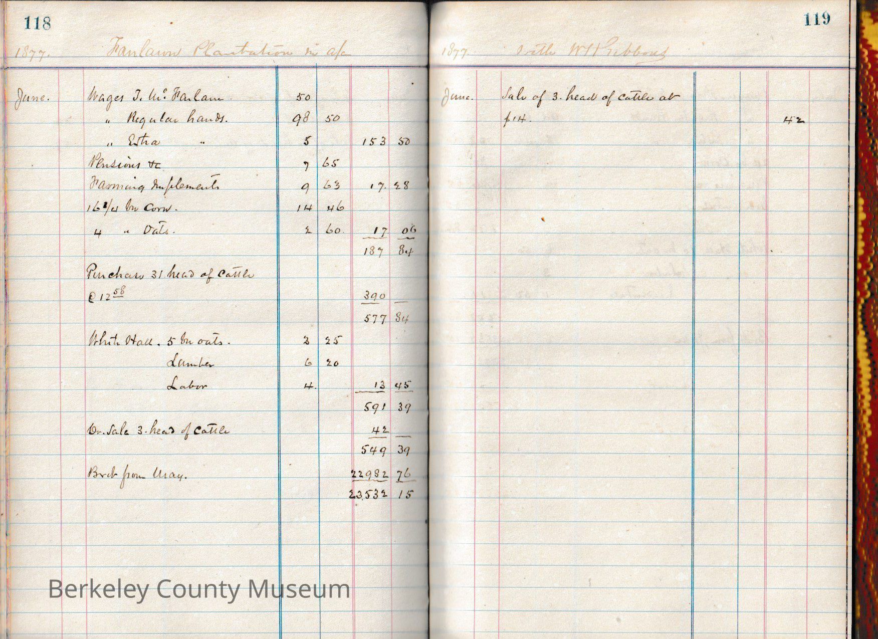 The journal account is of W.H. Gibbons. The overseer was T. McFarlane. Listings include building expenses at Whitehall, Christmas presents, farming implements, sales of rice, cattle purchases, payments to hands, etc.