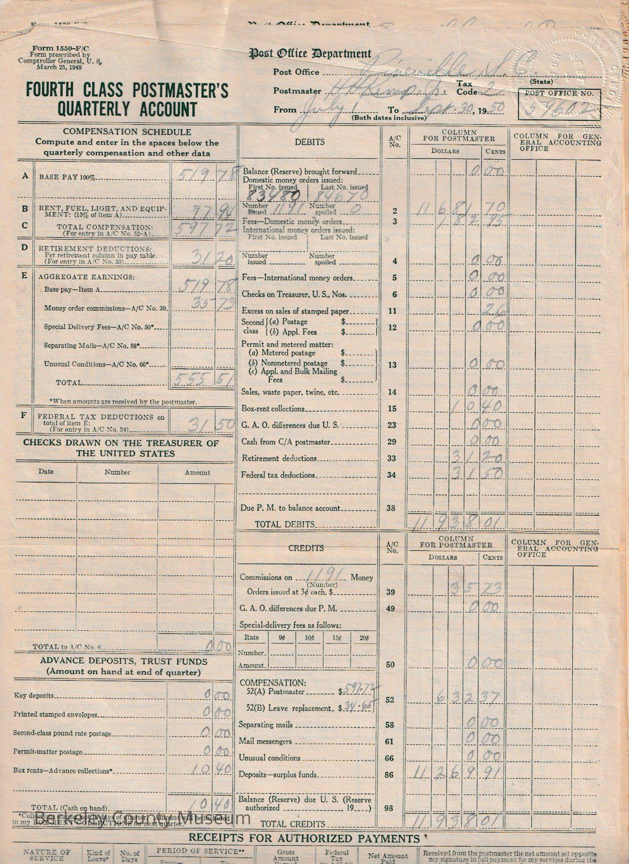 Fourth Class Postmaster's Quarterly Accounts, 1950-1951