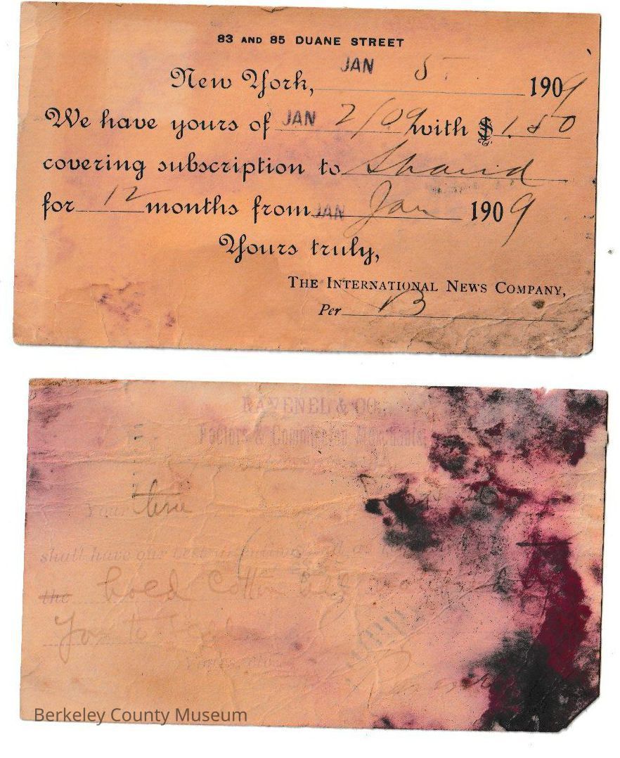 Two postcards to Mrs. R.Y. Macbeth. First postcard is confirming her subscription to Strand magazine for 12 months from Jan. 1909. The second postcard is from Ravenel & Co. Merchants but is mostly illegible; it appears to be a confirmation for halting the sale of cotton.Collection