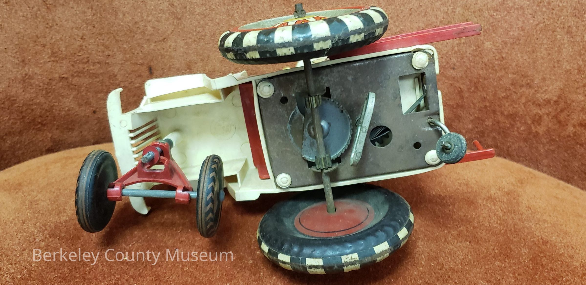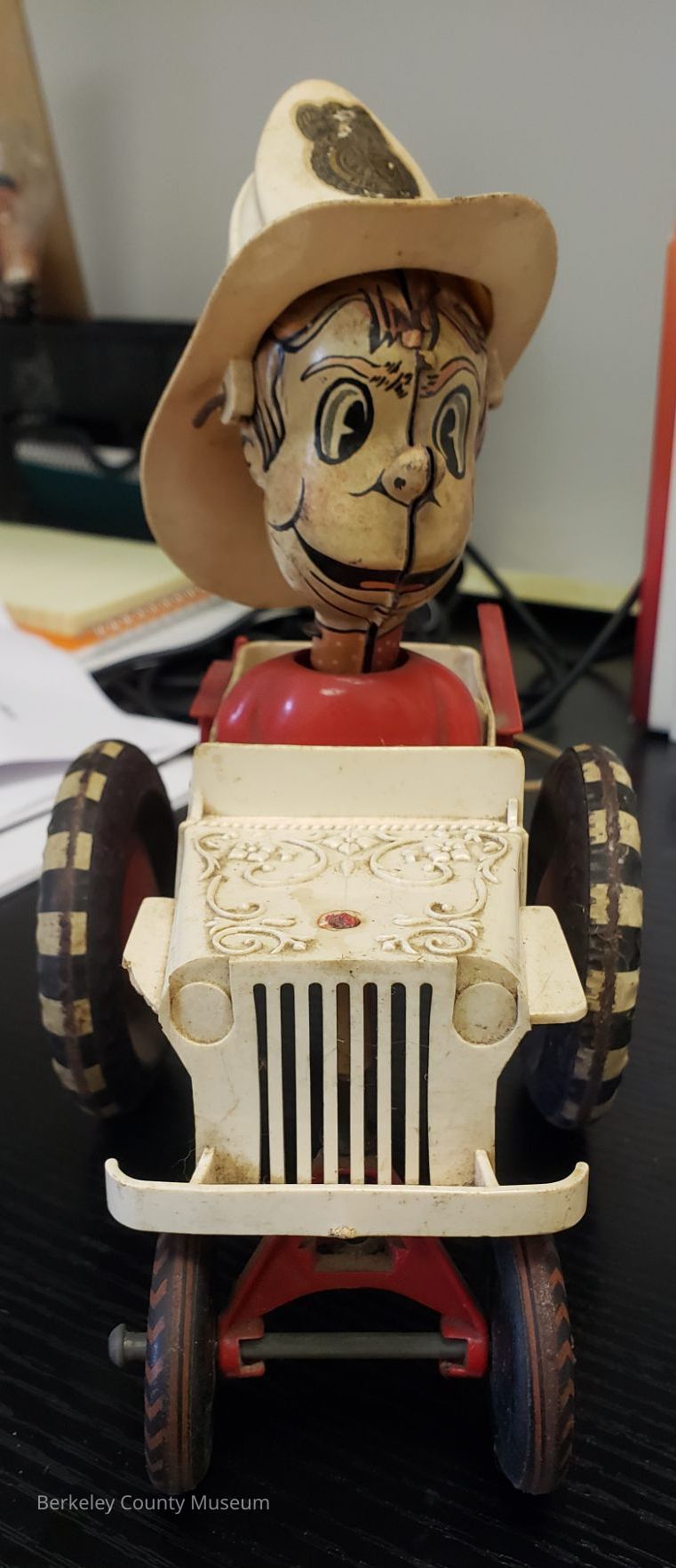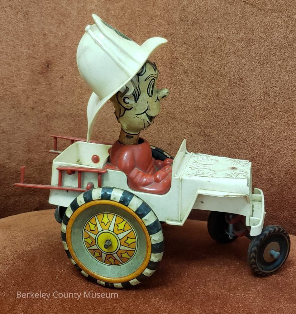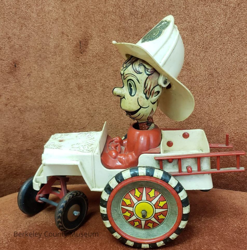 The image shows a toy, featuring a character with an expressive cartoonish face wearing a large tan firefighter hat, sitting in a stylized vintage car. The car is predominantly white with red accents and black tires.