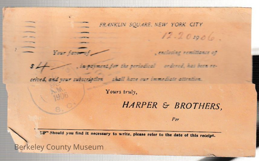 A postcard confirming payment for a subscription to Harper & Brothers as of 12.20.1906.