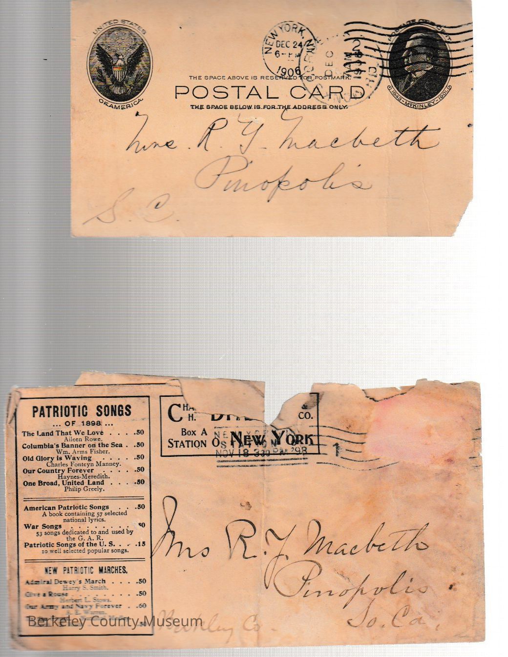 Envelope addressed to Mrs. R. Y. Macbeth of Pinopolis detailing a list of patriotic songs available for the year 1898.Collection