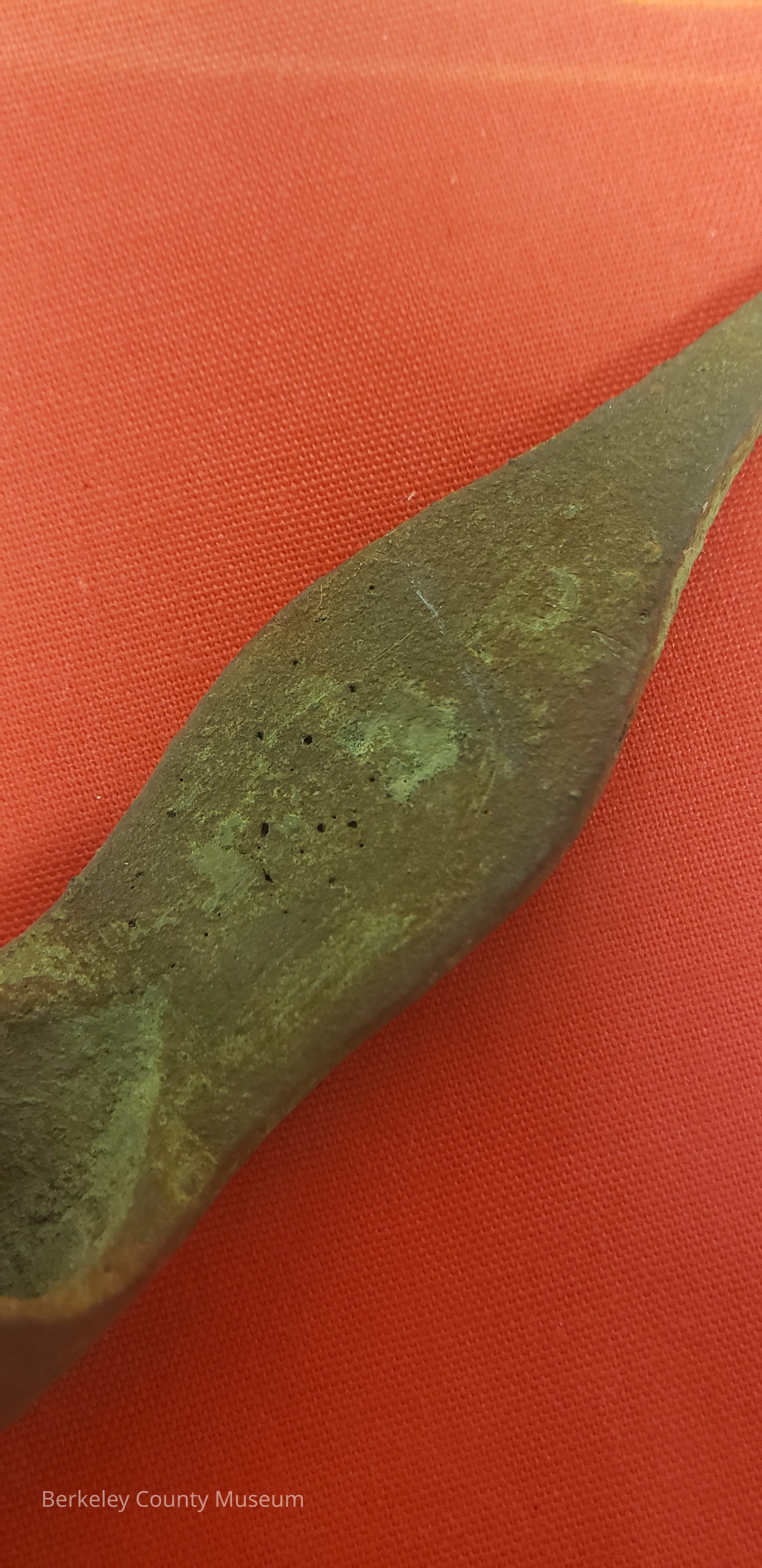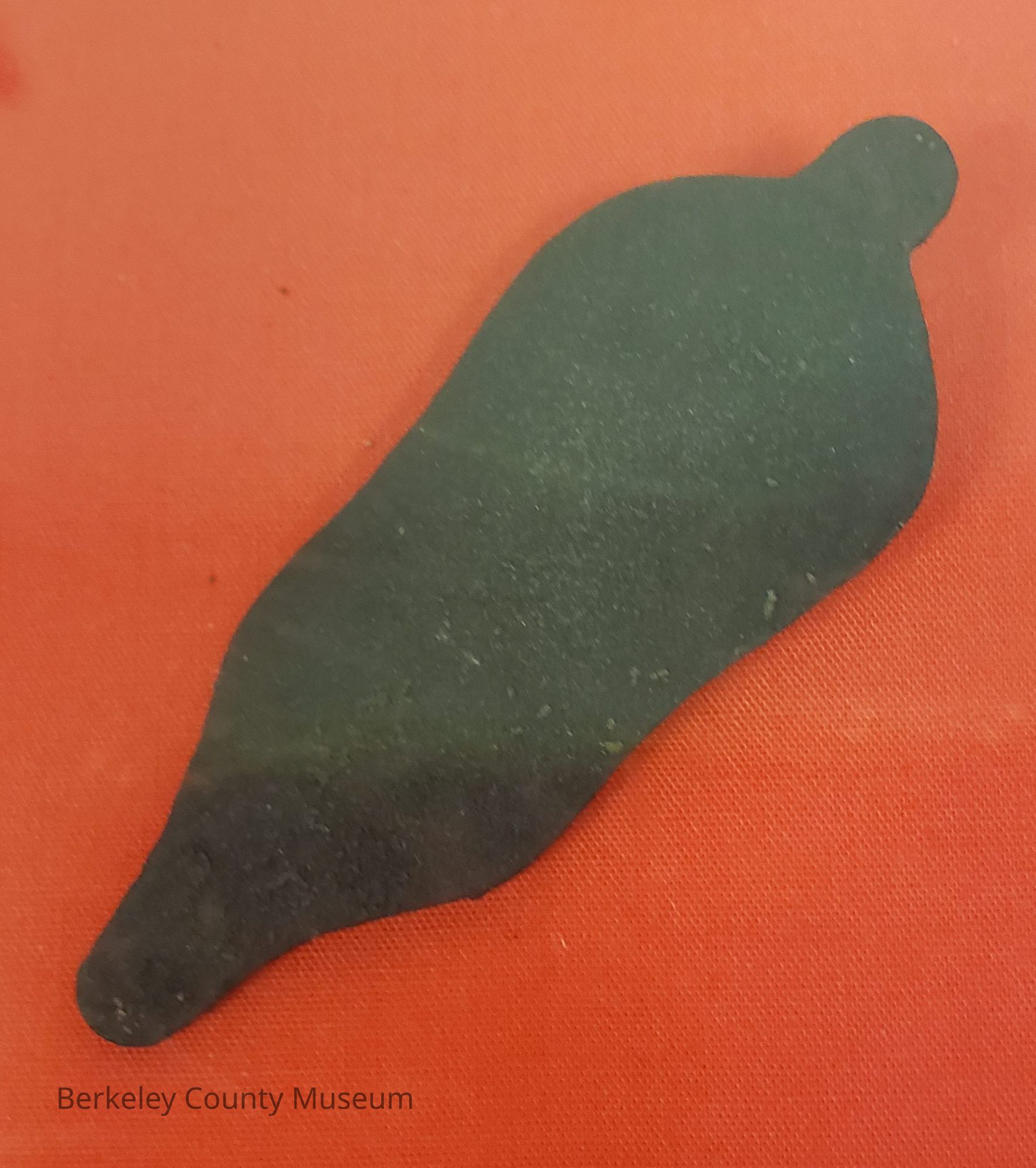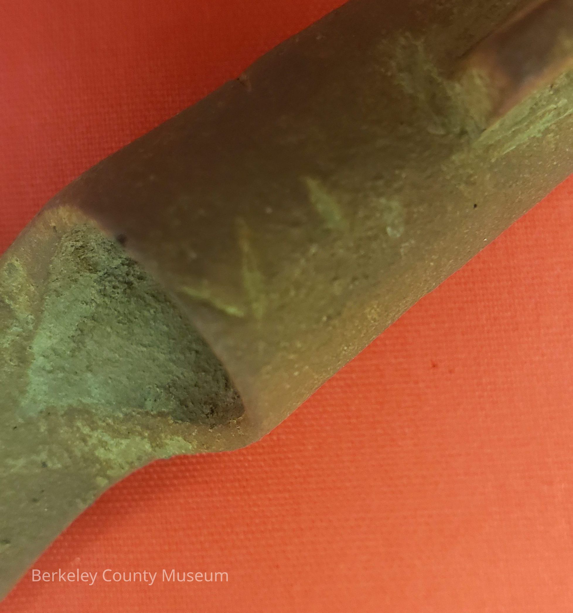 The image depicts a dark, worn escutcheon plate for a musket lying on a red surface