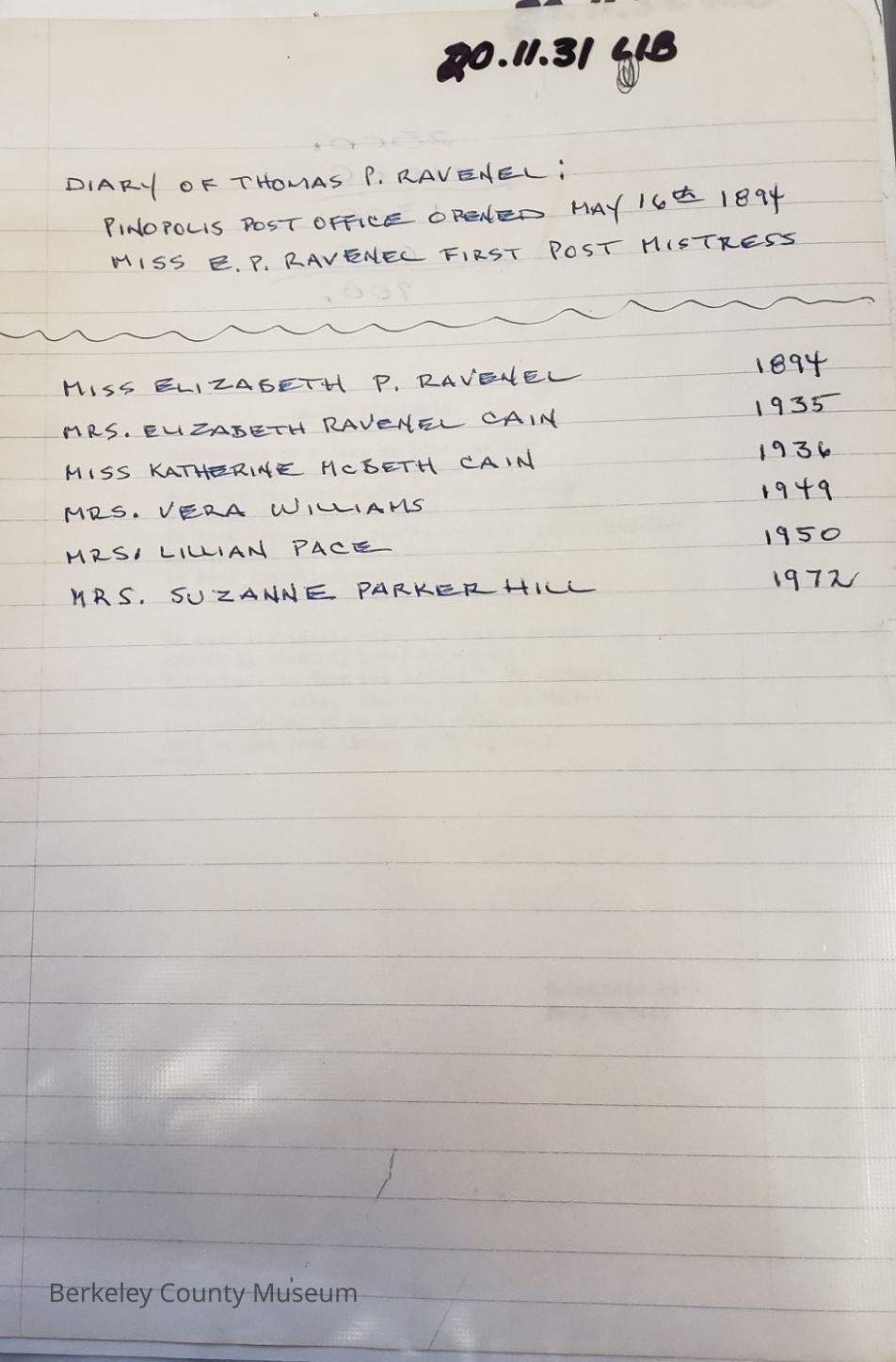 Postmasters of the Pinopolis Post Office, 1894-1972