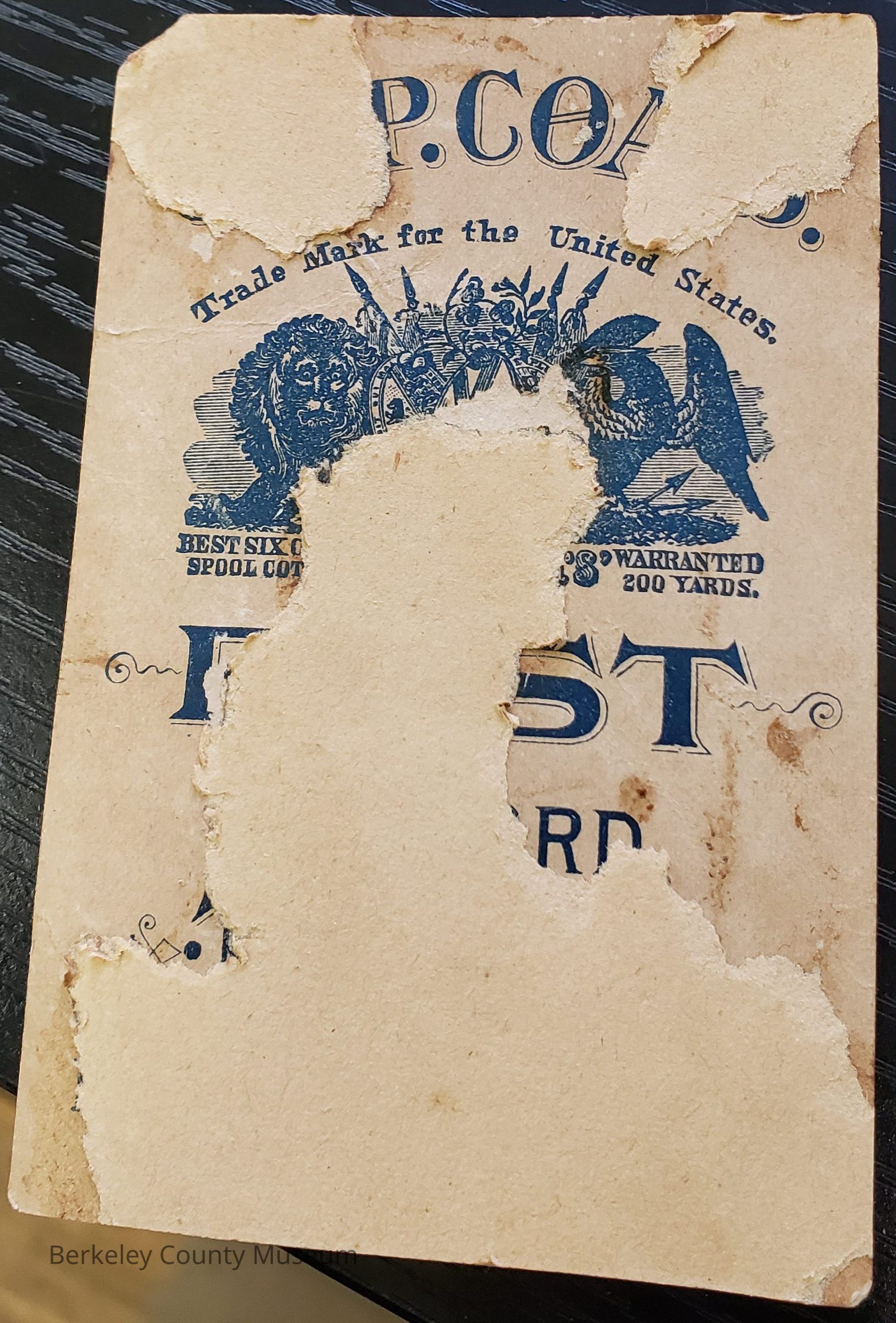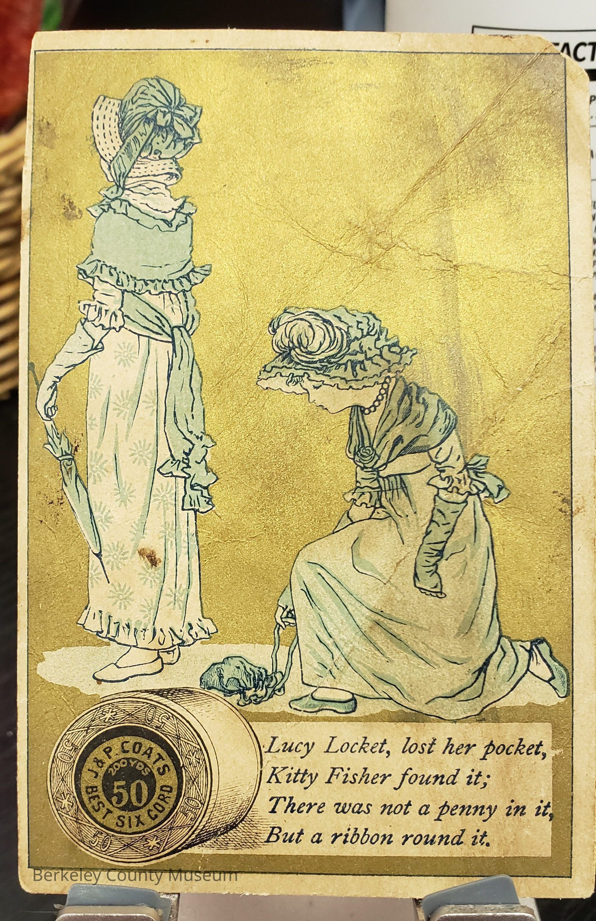 J&P Coats thread advertisement card. Cartoon of two women with "Lucy Locket" poem. The advertising on the back has largely been covered by brown paper. Size is approximately 2 5/8"x 4". Some typical wear.Context