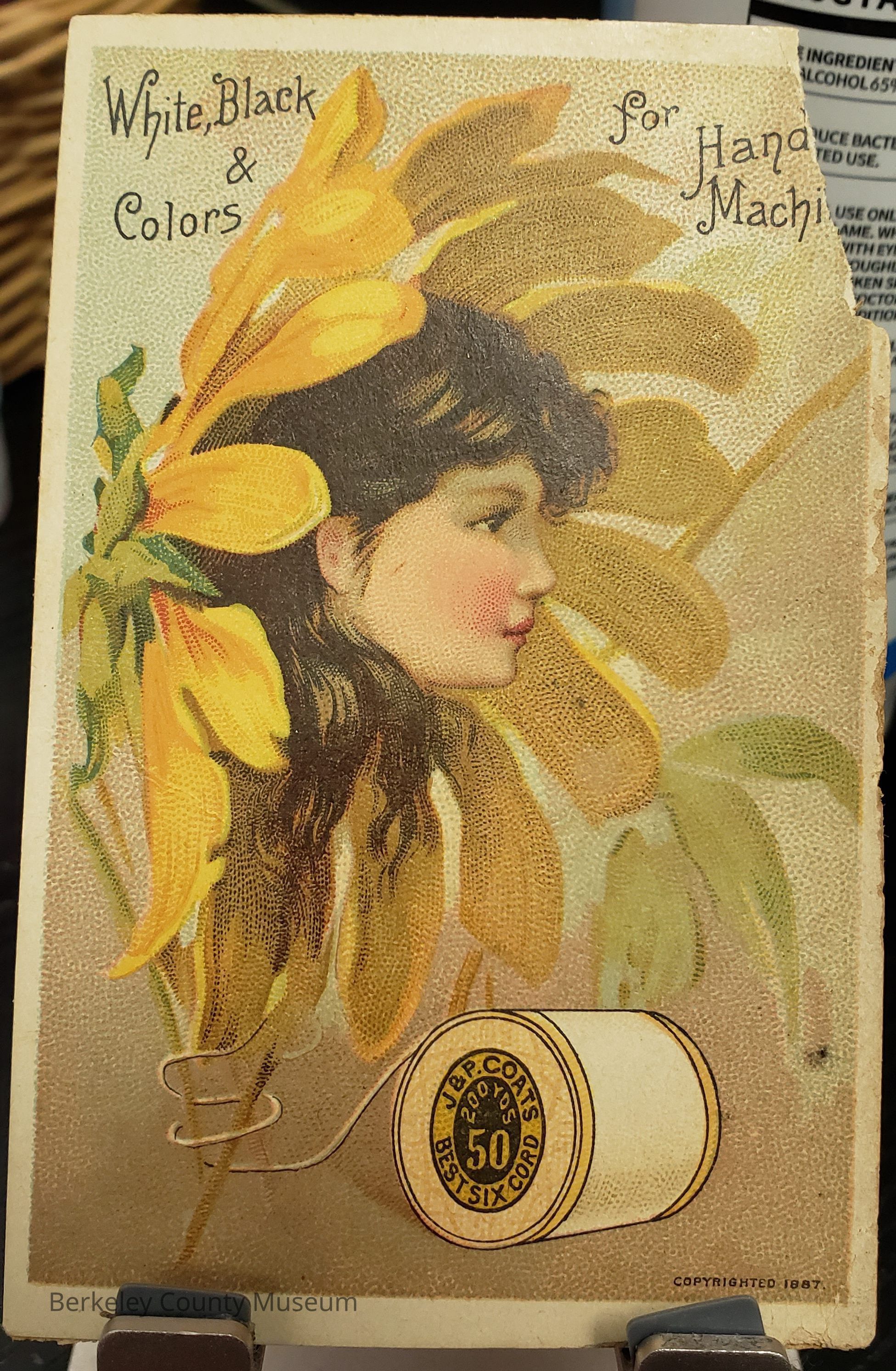 Victorian J&P Coats advertising card. Yellow flower & dark-haired girl's face. Back originally had text advertising J&P Coats thread, but has been covered with brown paper and part of a newspaper article. Rip in top right corner.Context