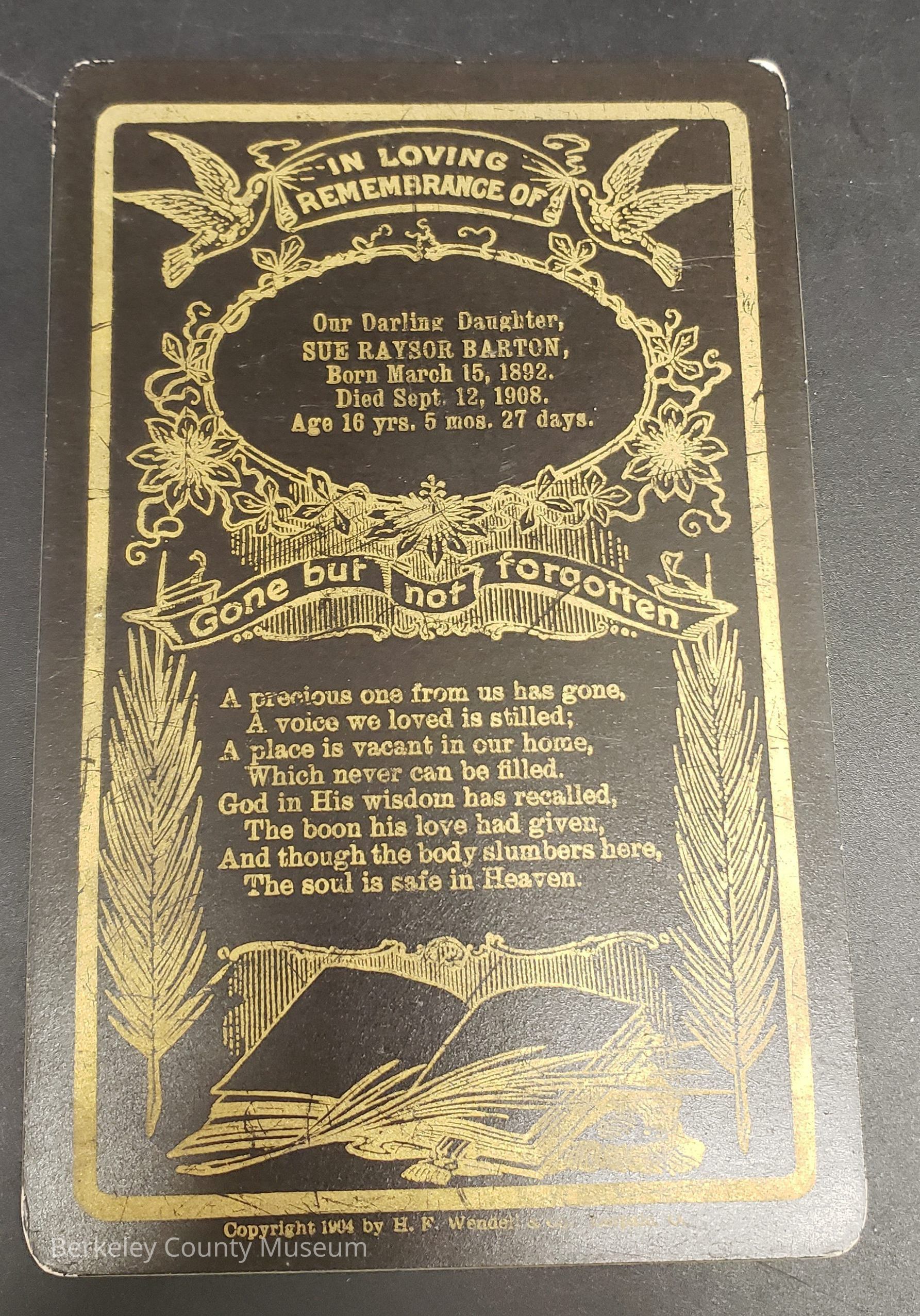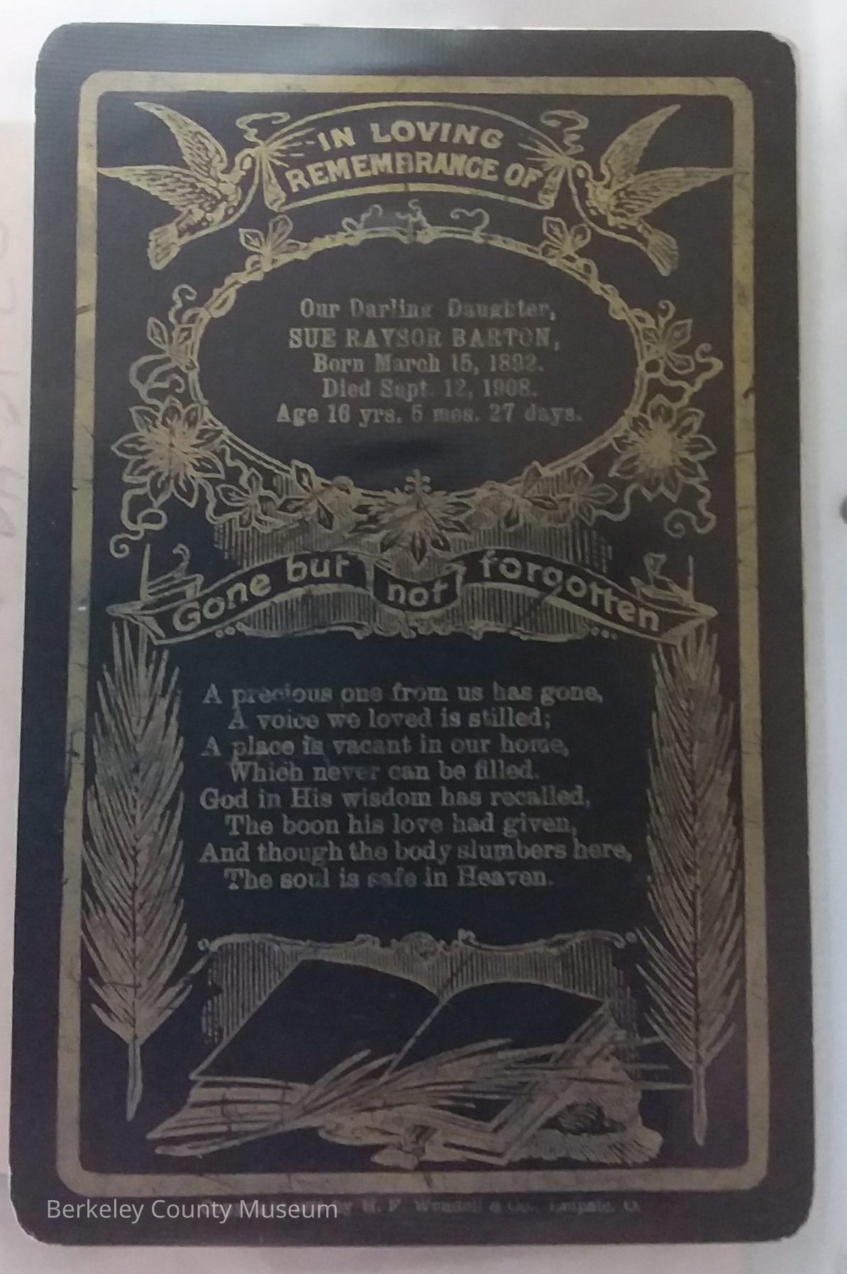 Memorial card for Sue Raysor Barton (1892-1908), daughter of T.F. and Nellie Barton. Sue died of an illness at age 16.