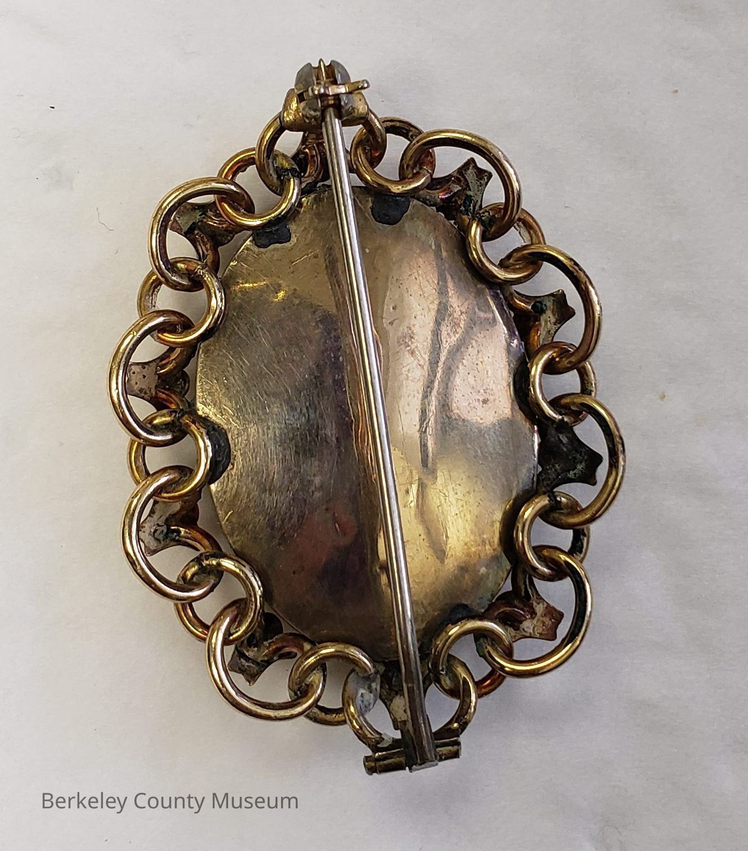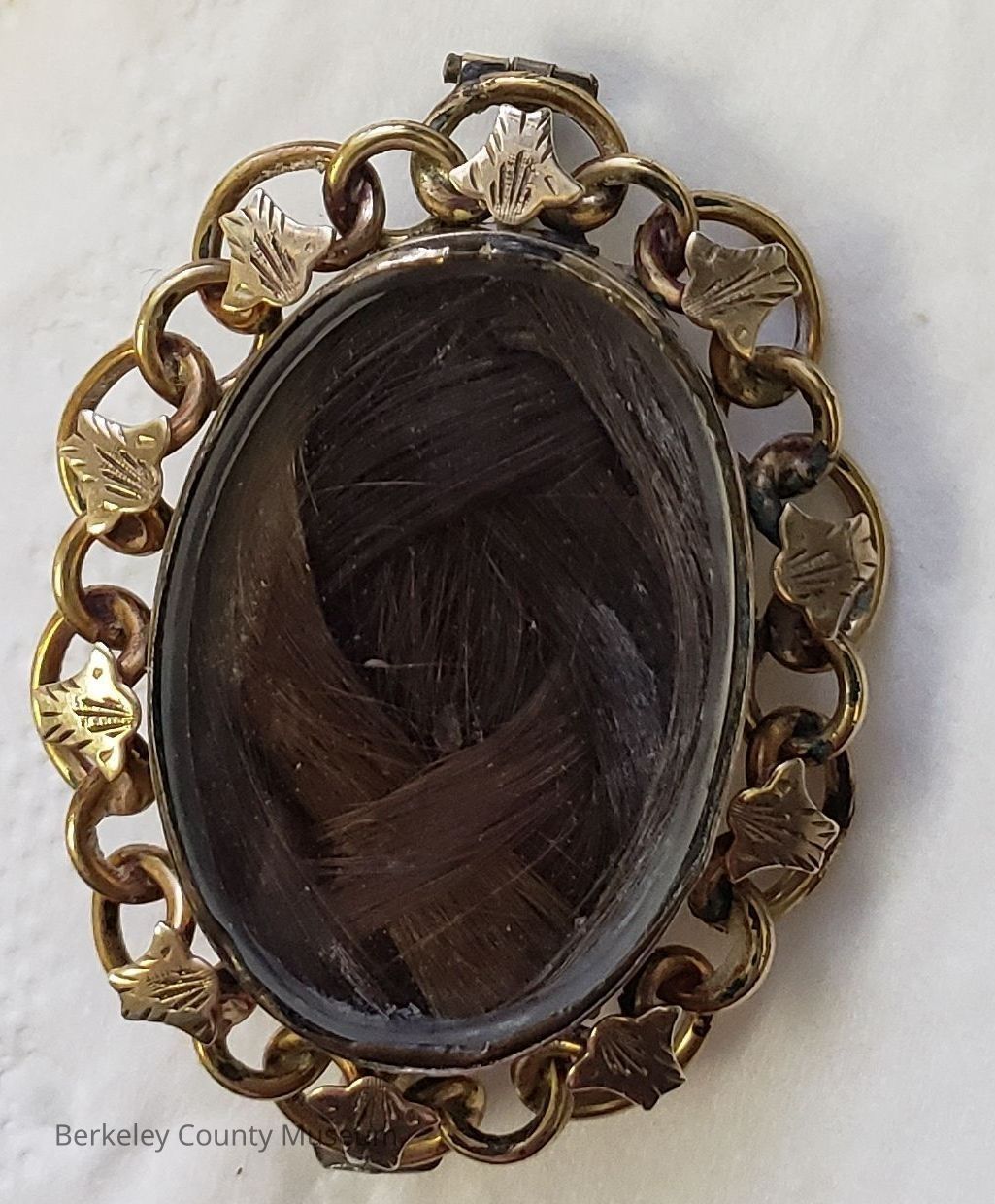 The image depicts an oval-shaped brooch with a delicate, ornate golden frame featuring floral accents. It contains a braid of dark brown hair under glass.