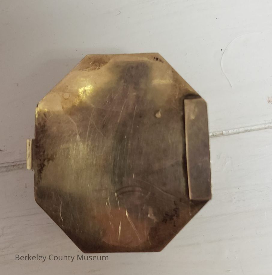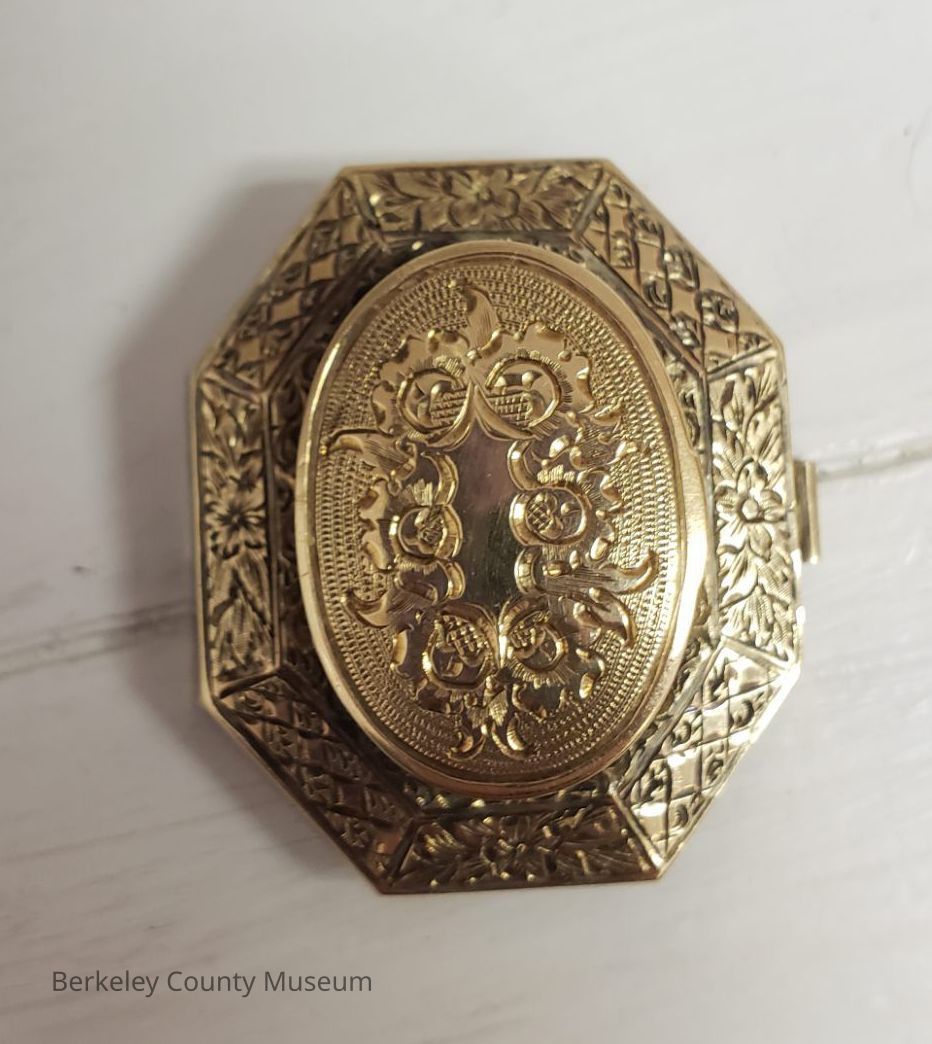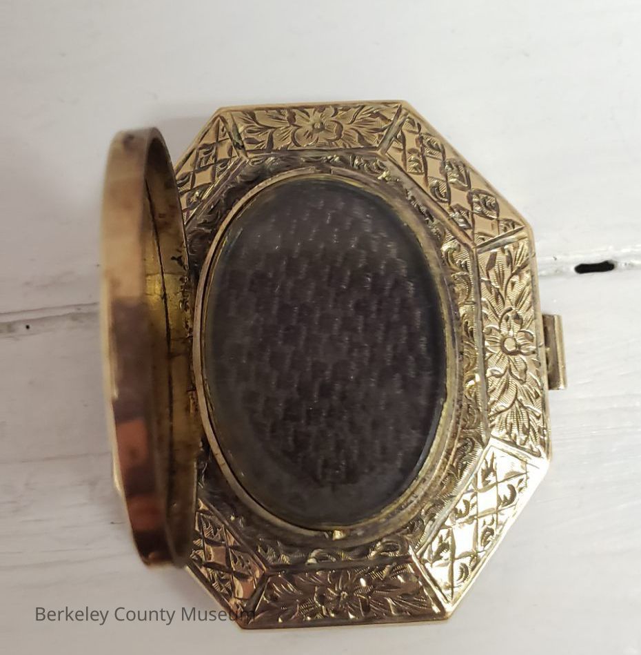 small piece of golden locket-style jewelry, possibly part of a bracelet. Checkerboard braided dark hair inlay. Mourning jewelry.