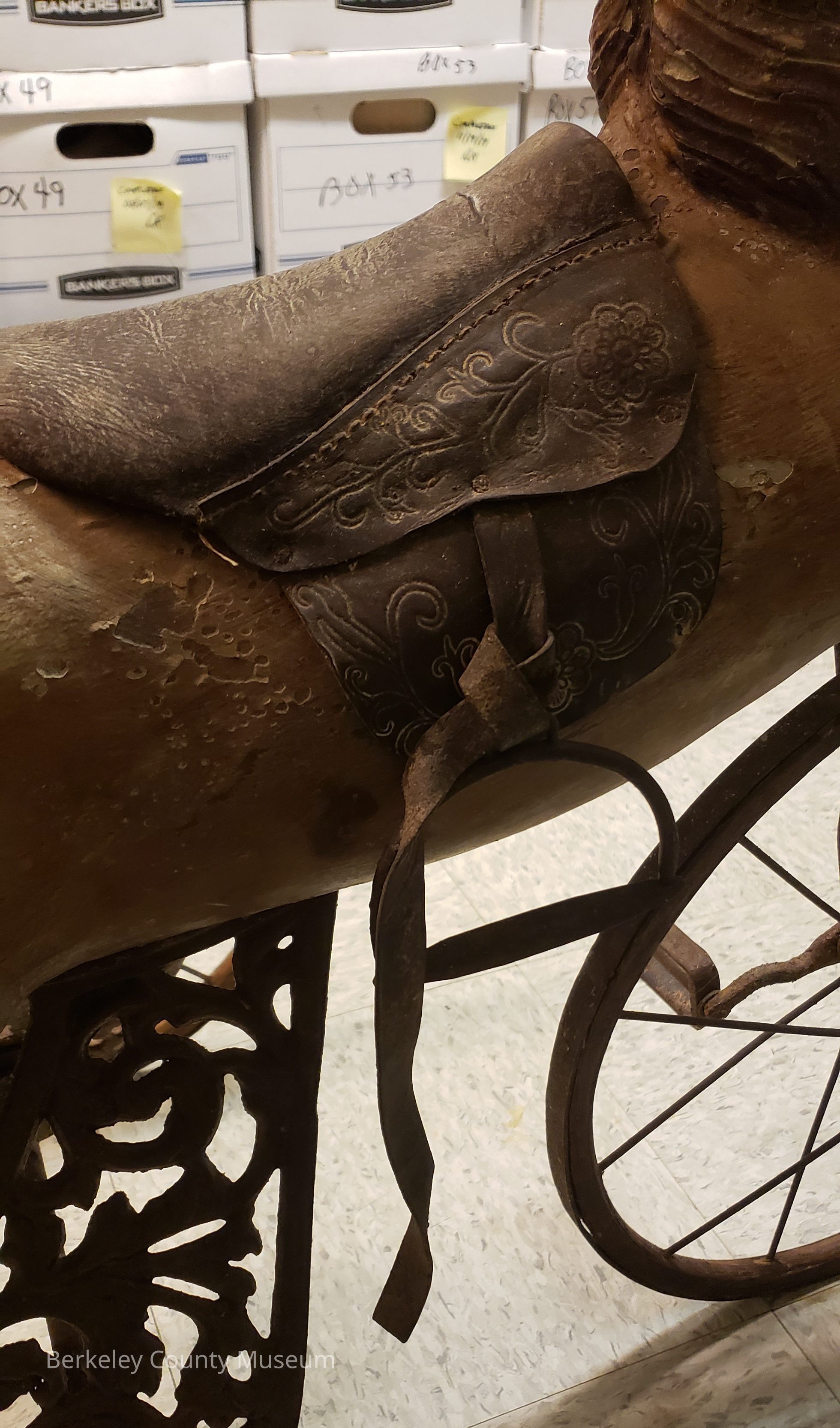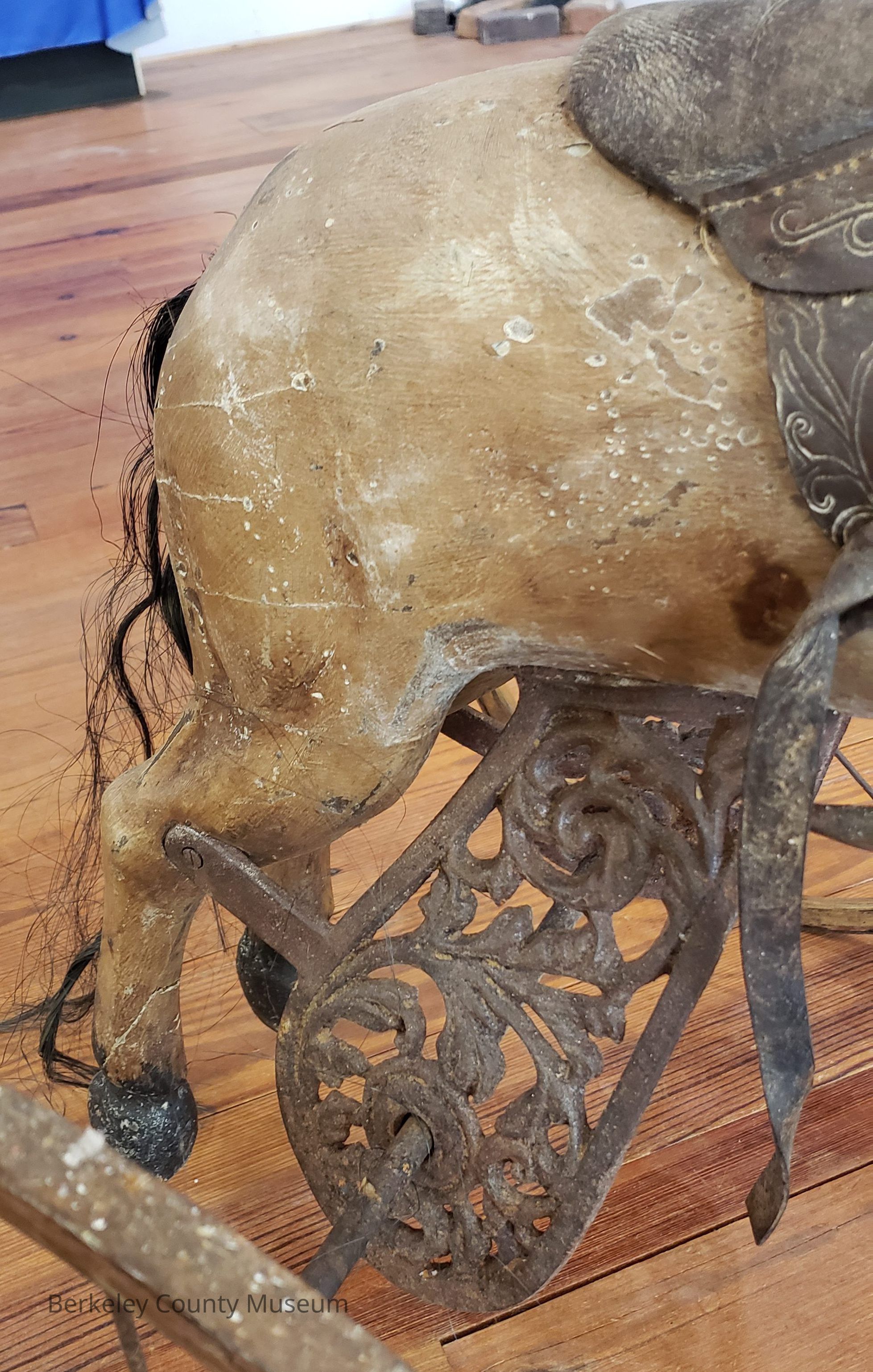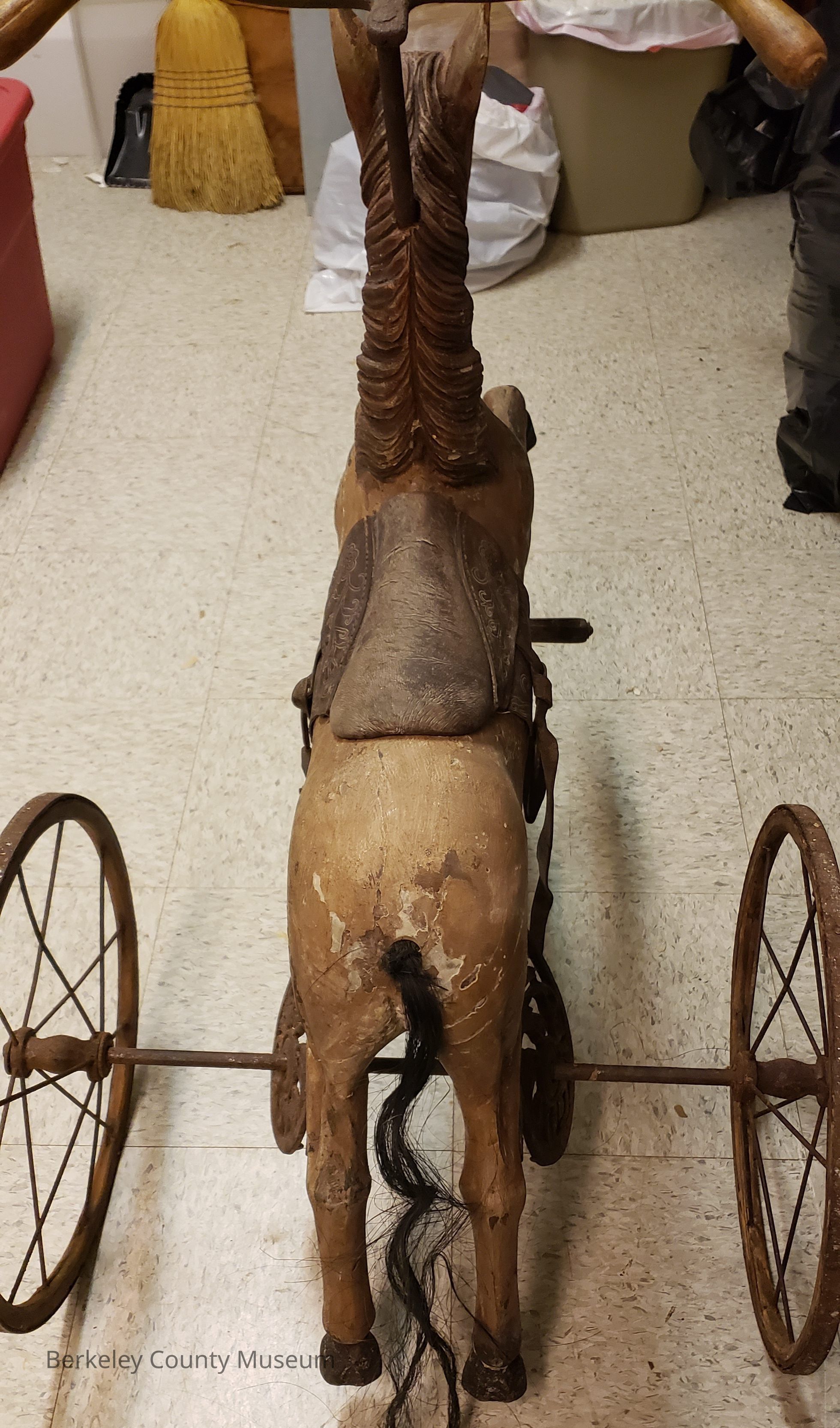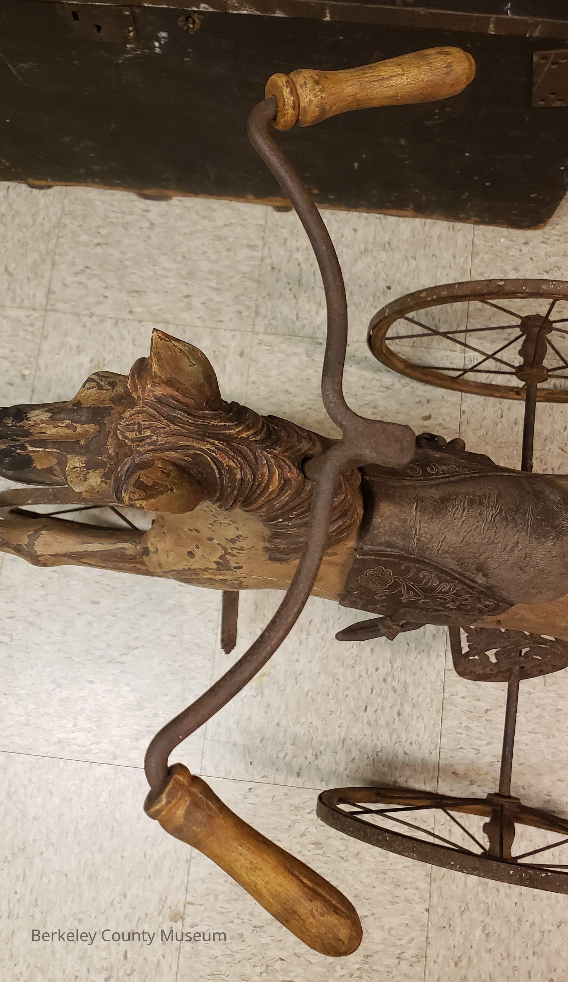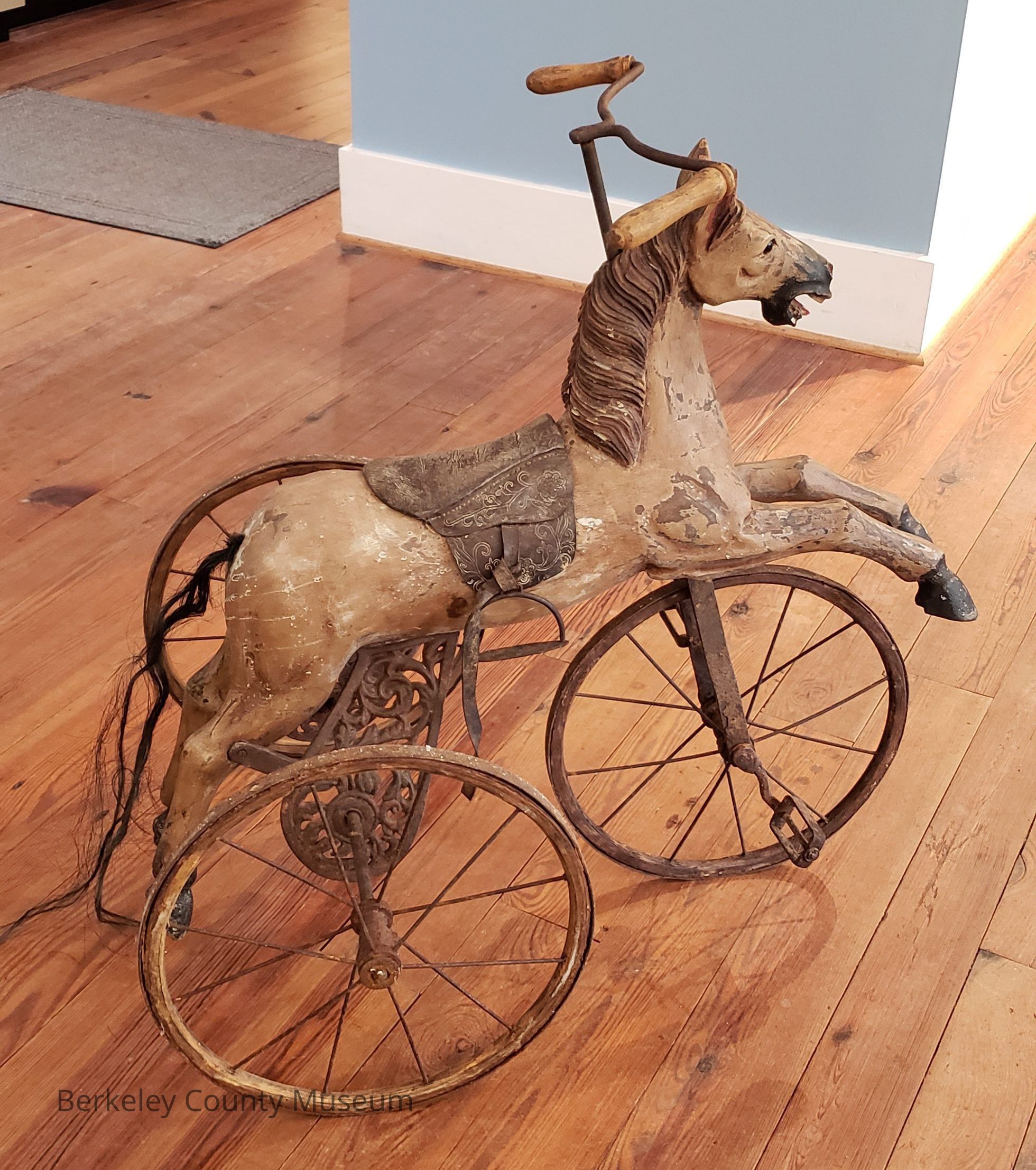 This image shows an antique horse-shaped tricycle made of wood and metal.