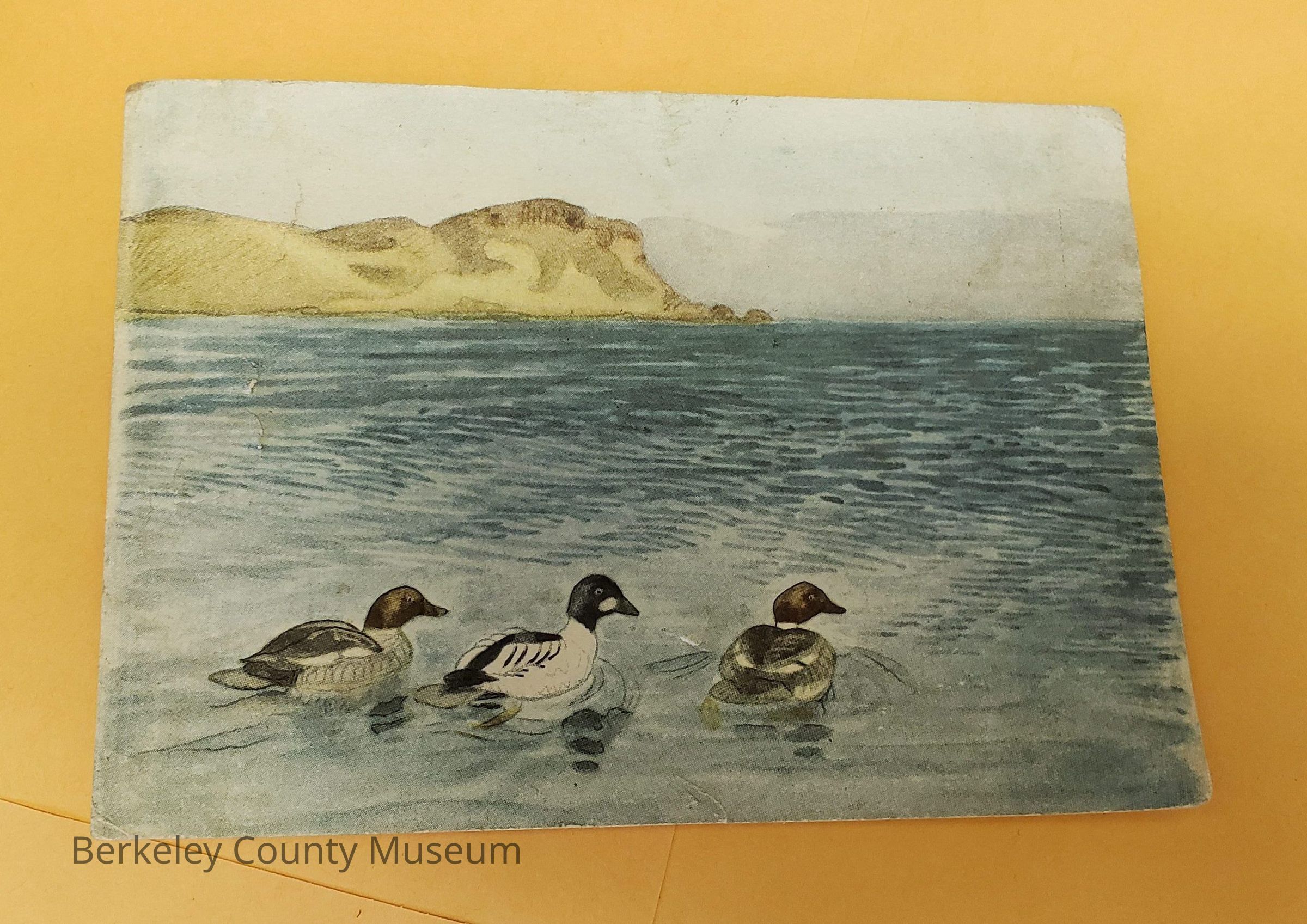 The image depicts 3 ducks swimming in a tranquil sea, with a barren hill in the background.