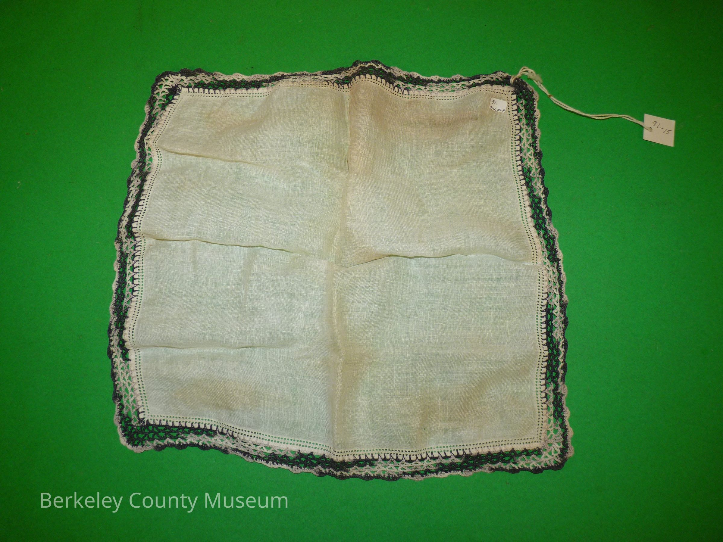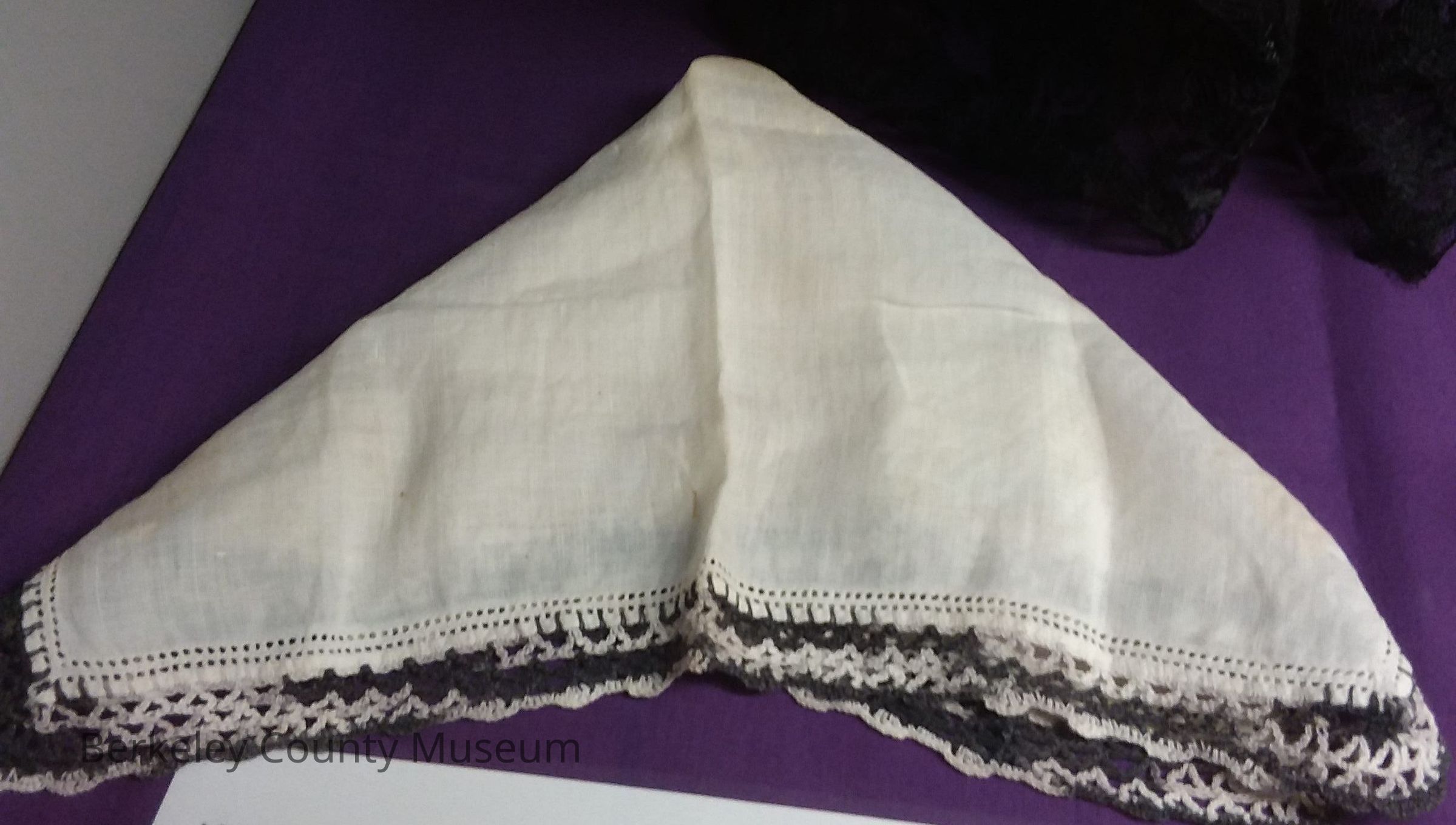 The image shows a white handkerchief with delicate black and white lace edging on a purple background.