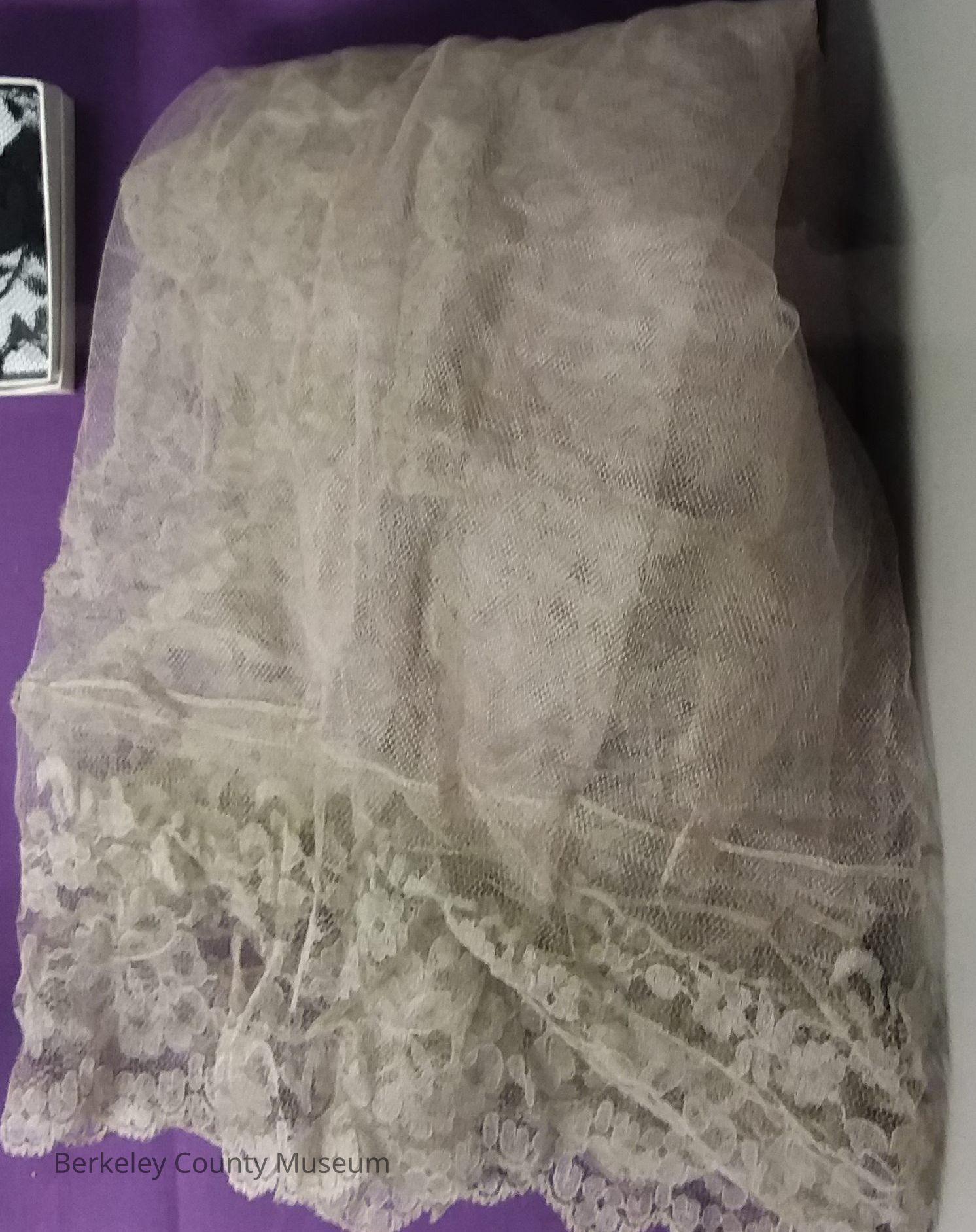 A pall (also called a casket net or casket veil) is a cloth that covers a casket/coffin at funerals. This early 20th-century version is made of off-white lace.