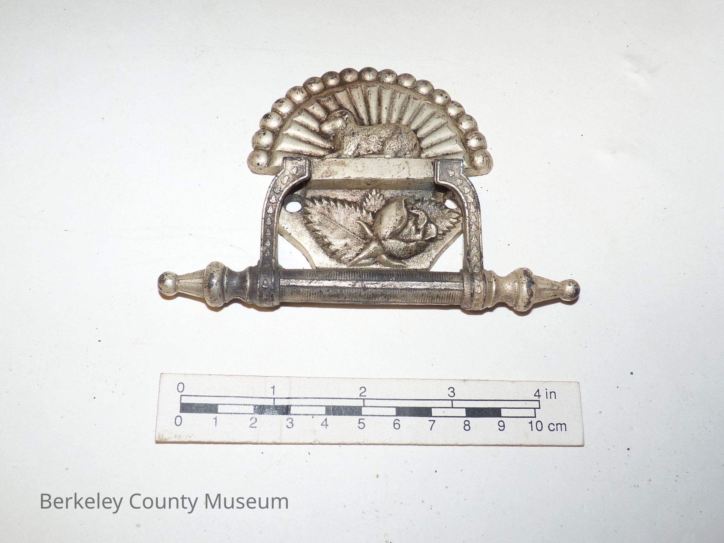 A silver-plated handle for a child's casket. Note the lamb motif.
