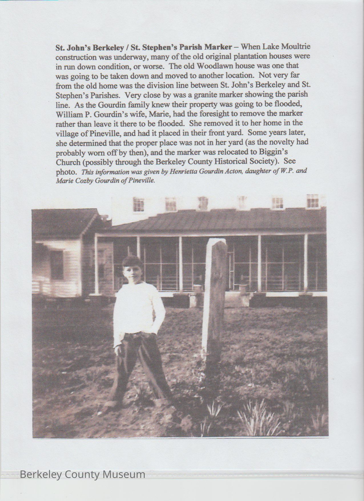 This marker was originally located by Woodlawn Plantation, which was near modern-day Pinopolis. When Woodlawn was going to be moved for the Santee Cooper Hydroelectric Project, the parish line marker was also moved. The marker was relocated to Pineville for a number of years before being moved to Biggin Church and finally to the grounds of the Museum.Acquisition