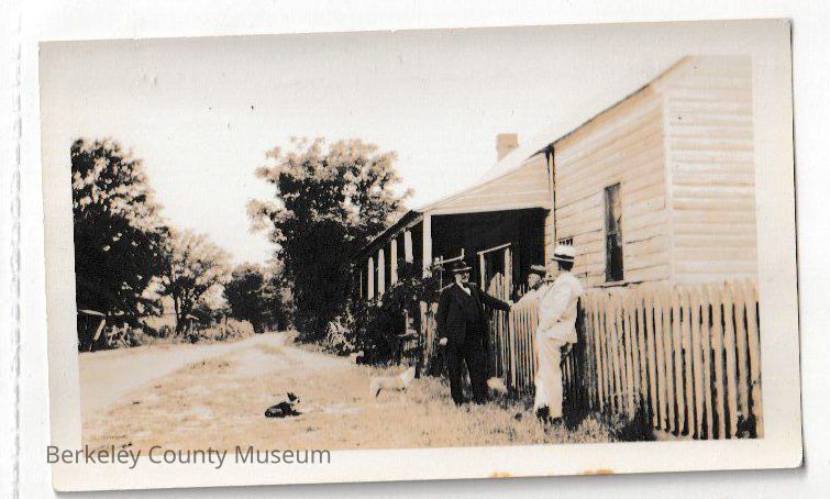 Old home of Mrs. Kate Harvey, Pinopolis Three men identified as: Mr. George Riggs (behind fence) Mr. Joseph Harvey (white suit) Mr. J.F. Brooks