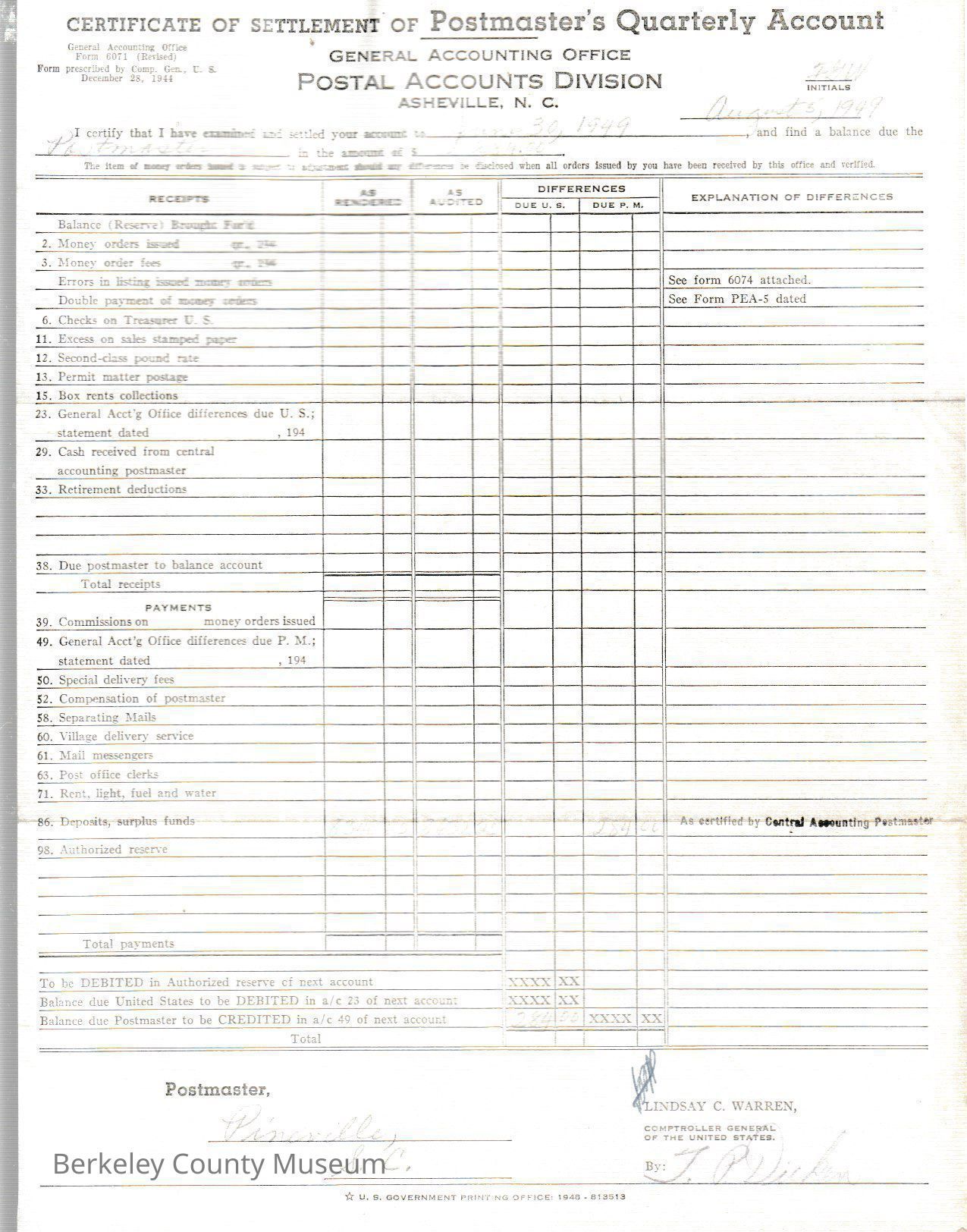 Certificate of Settlement of Postmaster's Quarterly Account, 1949