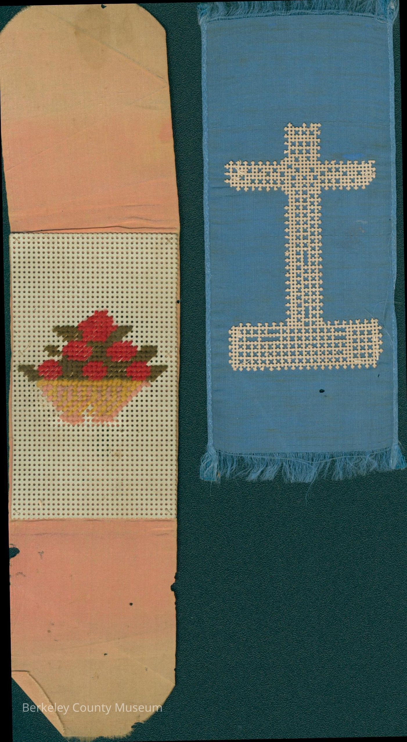 A needlepoint picture of flowers in a bowl, and needlepoint canvas cut into the shape of a cross. Both pieces have been attached to lengths of fabric. Also known as punch paper.