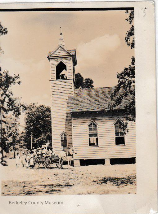 A photo labeled "Zion Church." In front of the church is a group of people standing near a horse-drawn buggy. Likely Mount Zion United Methodist Church in Jamestown.