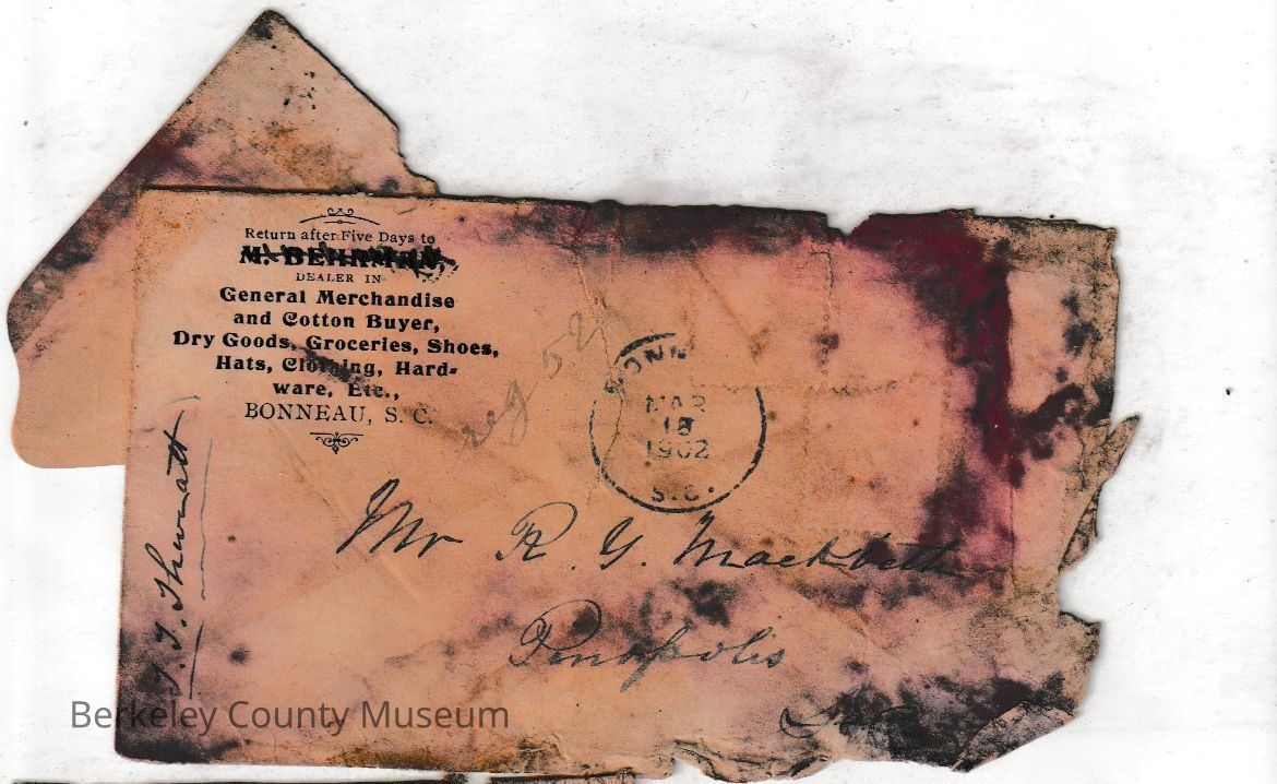 Envelope addressed to Mr. R.Y. Macbeth, Pinopolis. On the side is the return address of M. Behrman, which has been scratched out. T.T. Thweatt has been written on the side. Postmarked Moncks Corner, Mar 18 1902.Context