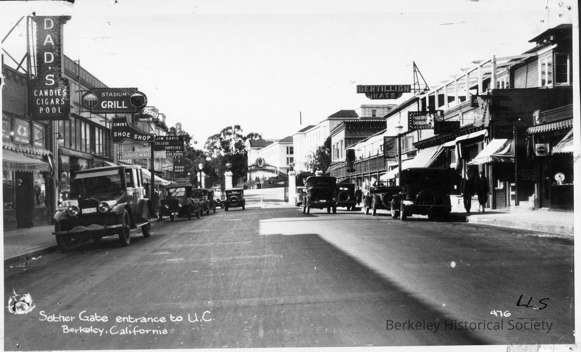 Telegraph Ave, Sather Gate, Barney Beanery, Dick's College Supplies, Station Grill, Moon's Typewriters,, Dad's candies