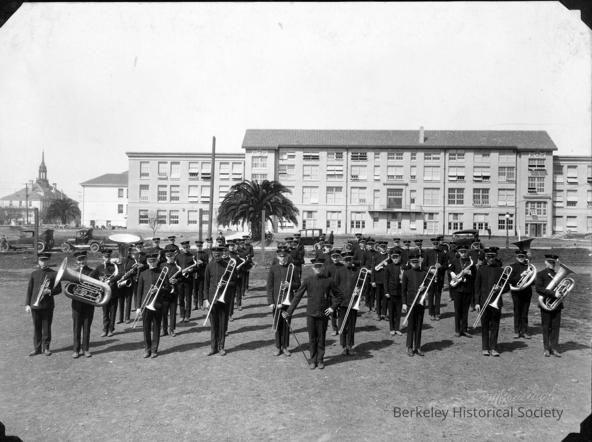 Marching band in formation on field with school building in background. City Hall in distance to the left.Other Names and Numbers