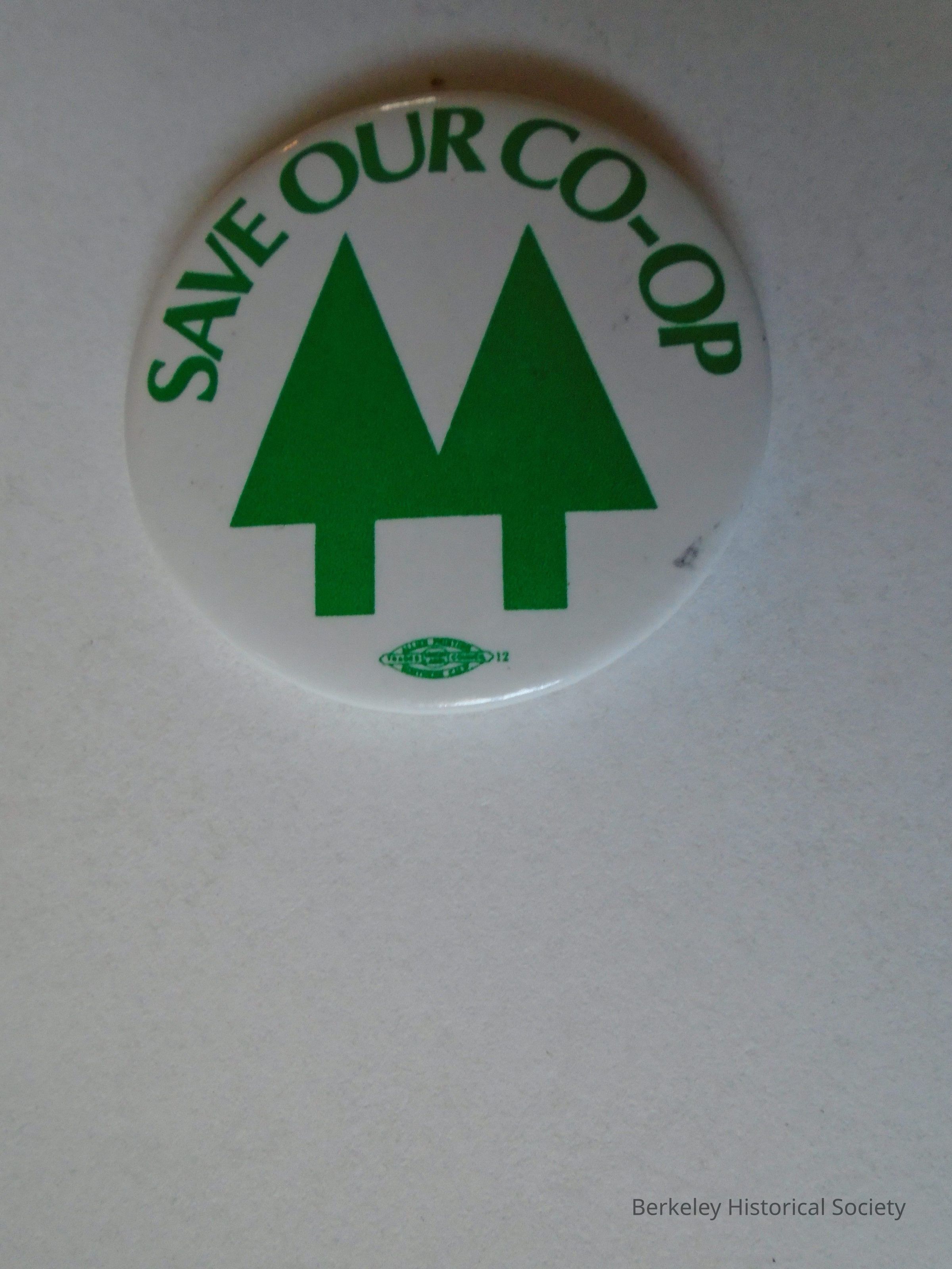 Metal & paper Co-op button in white and green with Co-op logo: Save Our Co-op.