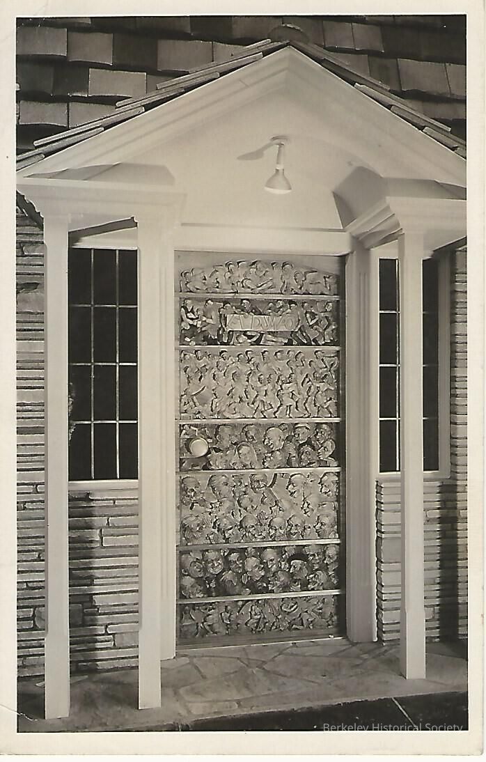 Black and white photographic undivided back postcard. Photograph of entrance door carved by Emil Janel.