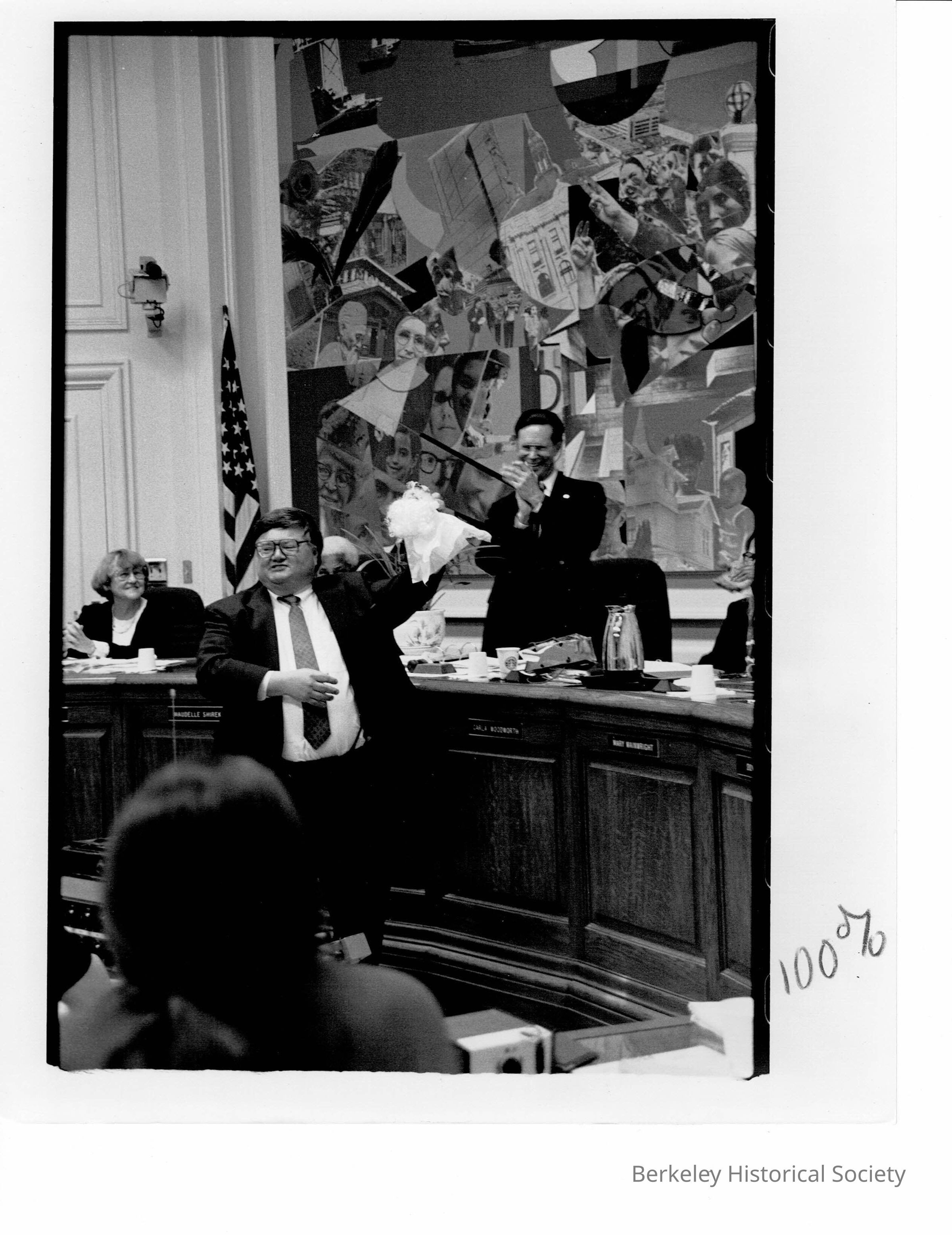 Colignon waving a prize of some sort in undated photograph. Behind him is Jeffrey Shattuck Leiter standing and applauding. Photo taken in City Council Chamber.Dimensions