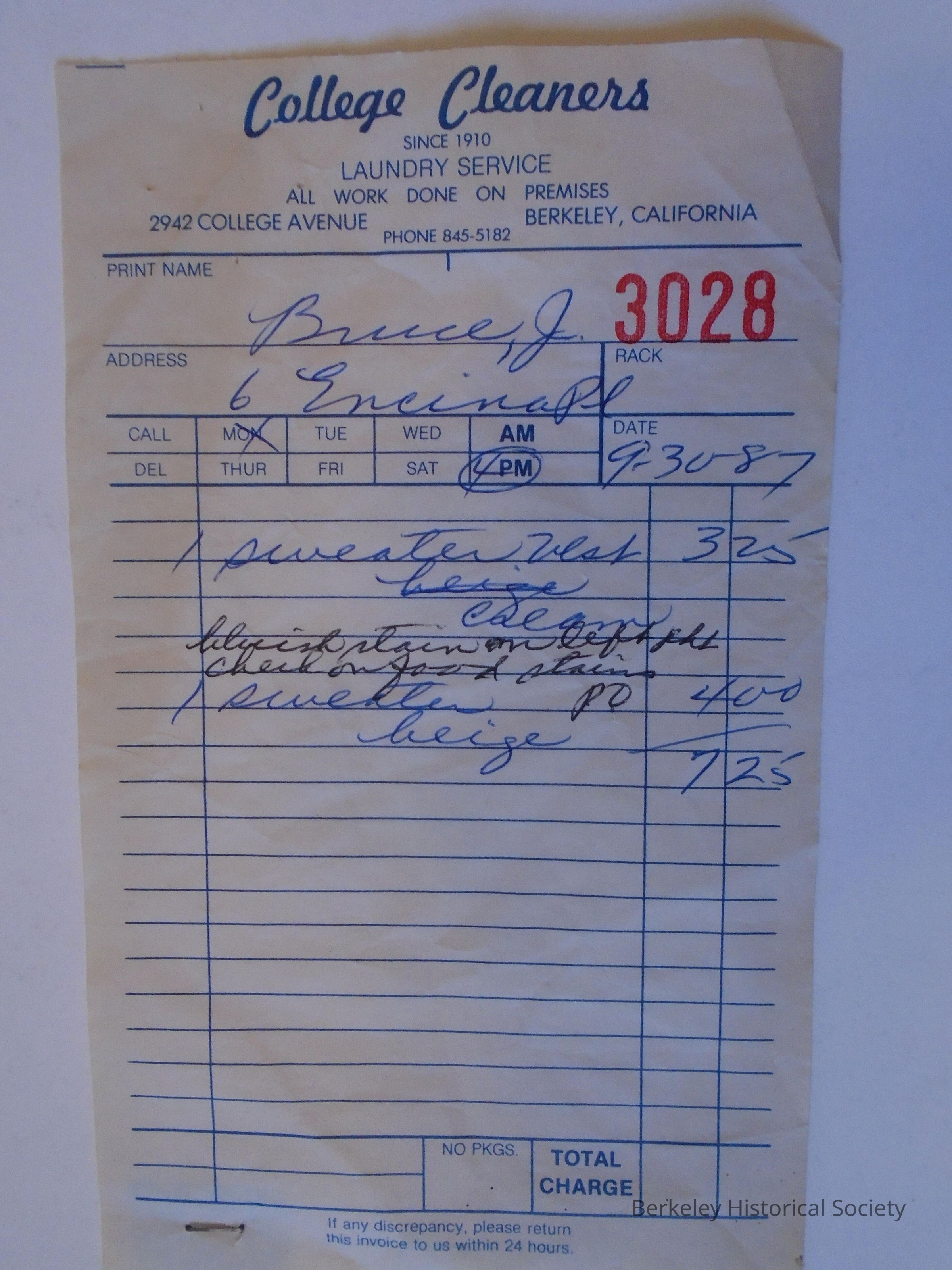 Paper receipt for College Cleaners, 2942 College Avenue, Berkeley, California, Phone 845-5182. 2 sweaters cleaned. Green tag #2 stapled at bottom.