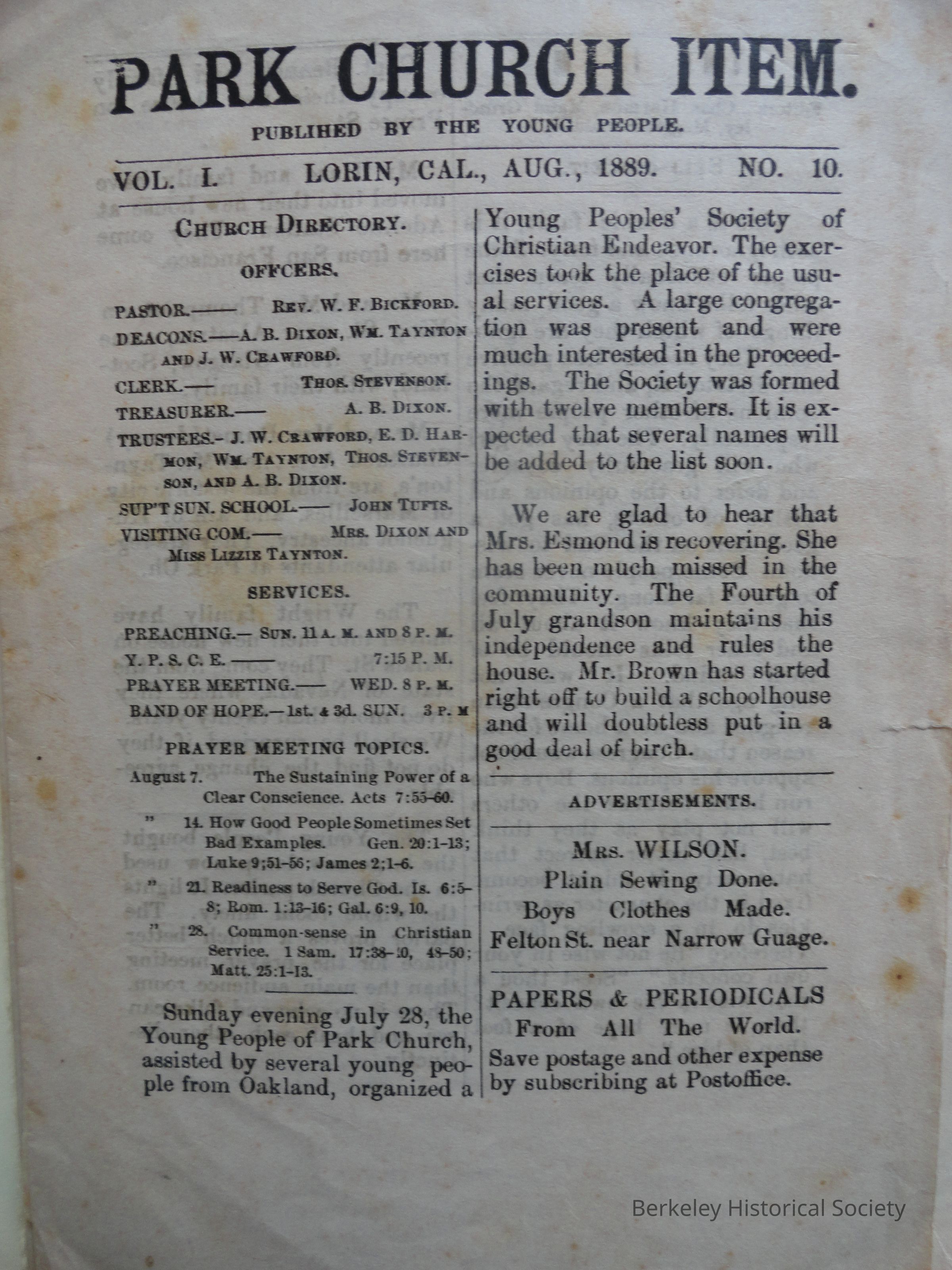 Admin or Bio Notes: The church was established in 1883 in the Lorin District; a new building was designed by Storch in 1912. The church later was called the South Berkeley Congregational Church.