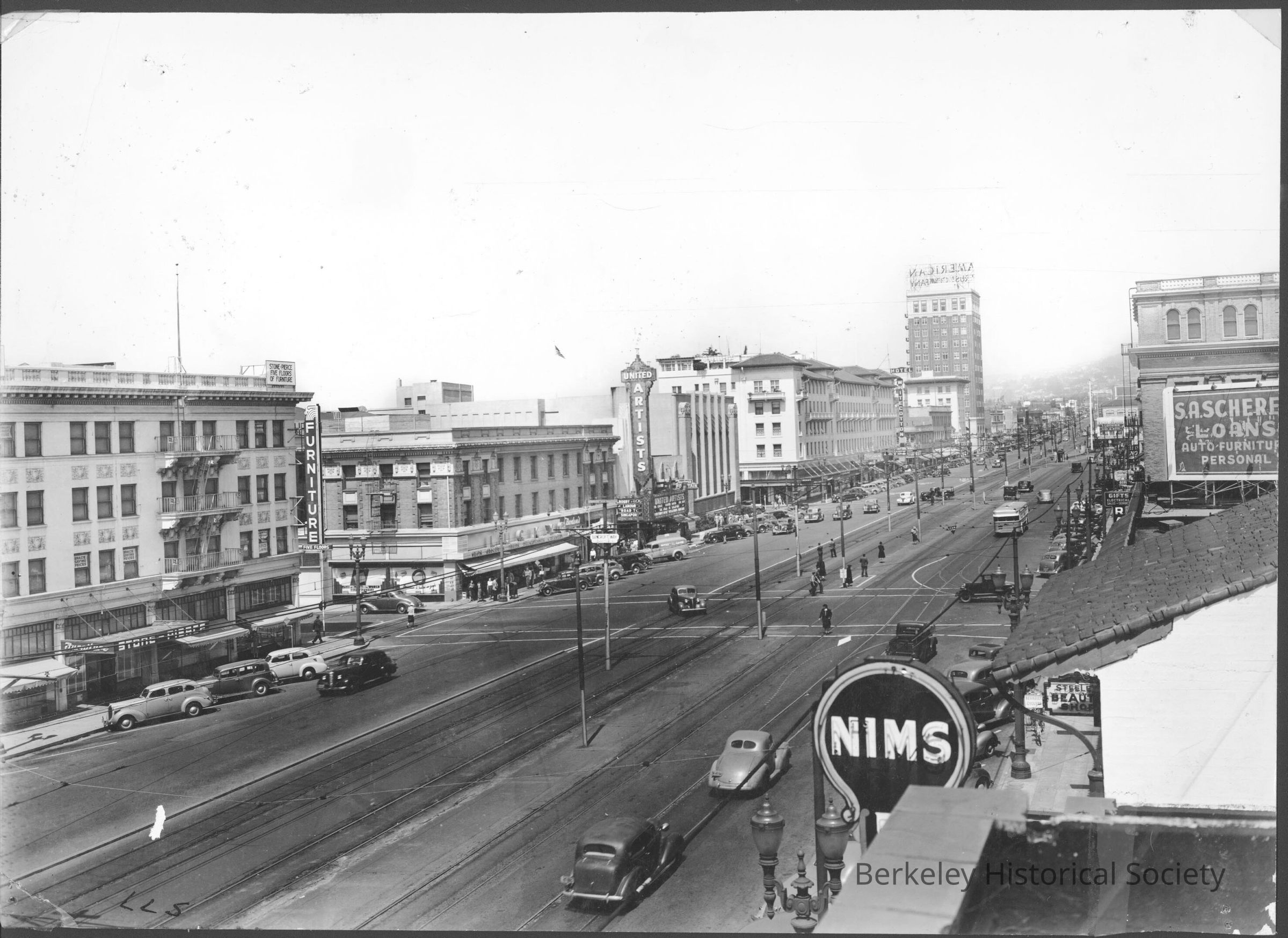 View north from top of building on east- side of street, from intersection with Bancroft Way. Large signs visible for Stone Pierce Furniture, United Artists, American Trust, Nims Furniture.Lexicon