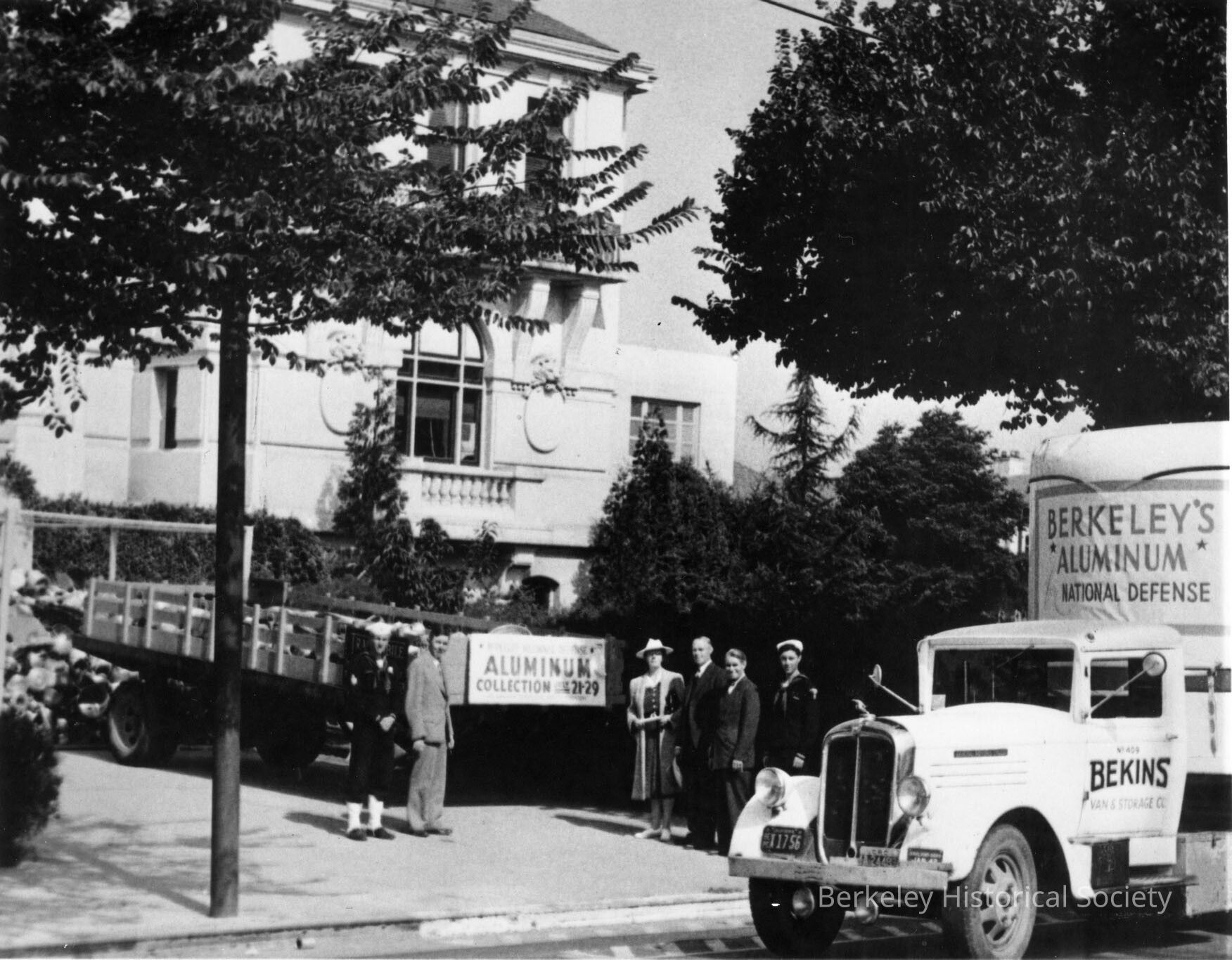 Group at collection point in front of City Hall; Bekins truck with sign "Berkeley's Aluminum National Defense" to right.Other Names and Numbers