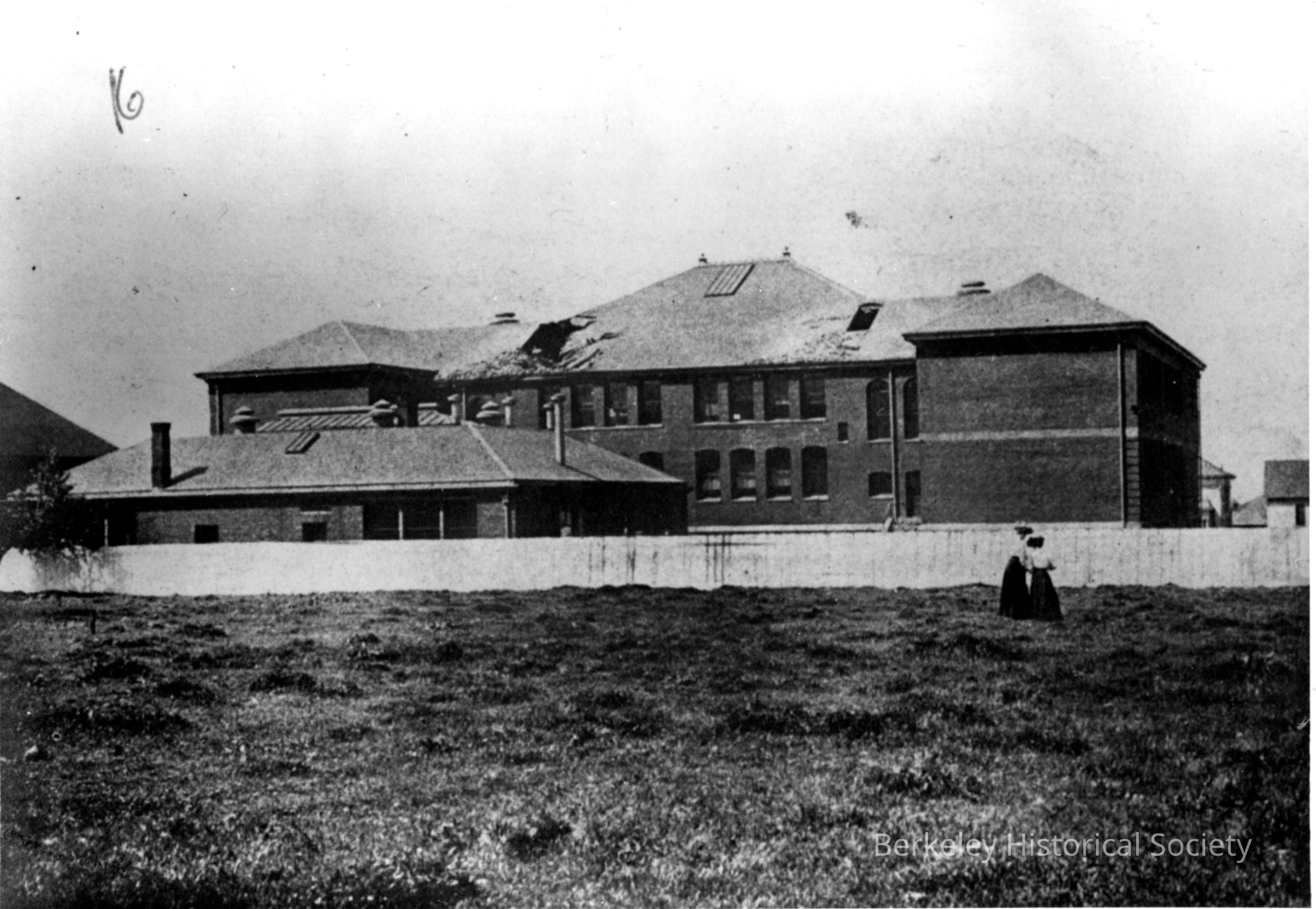 View of building across empty field; two women visible. Taken from Milvia Steet and Channing Way.Dimensions