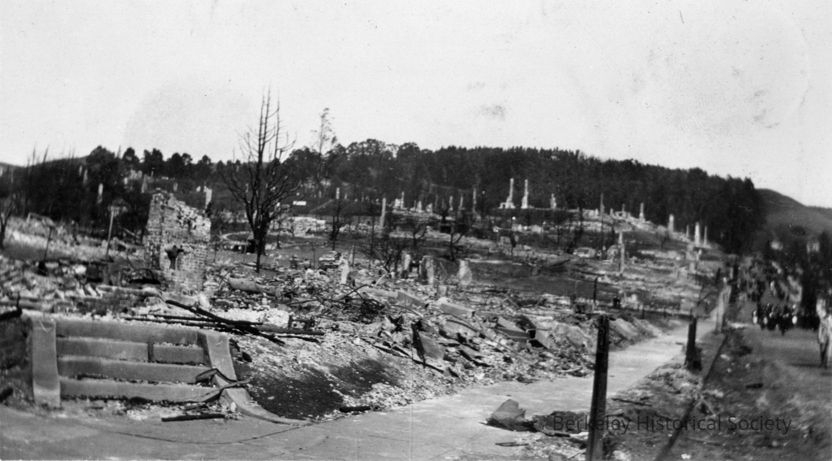 Aftermath -- burned hillside; foreground to left small staircase to destroyed property, set diagonally to corner sidewalks.