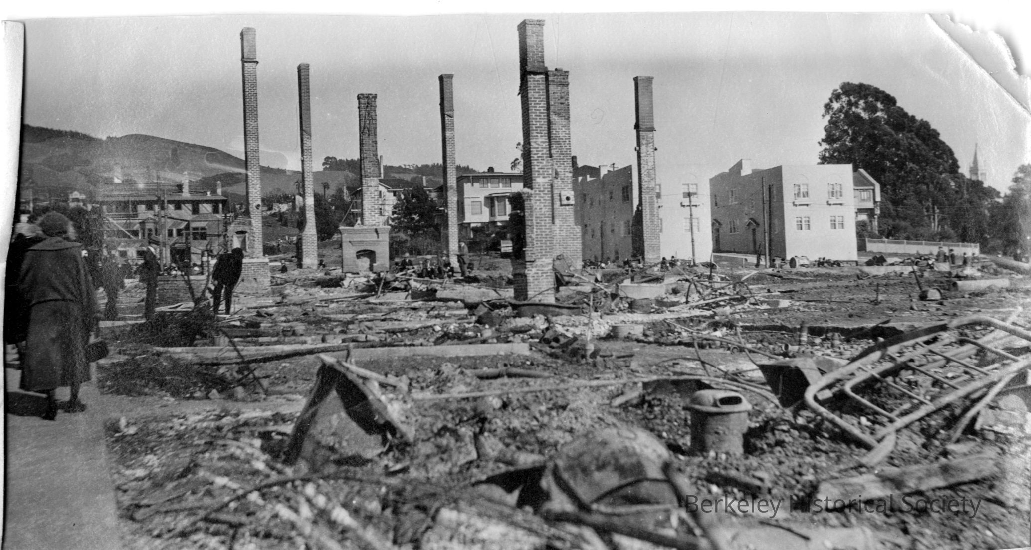 Standing chimneys; a few people to the left.