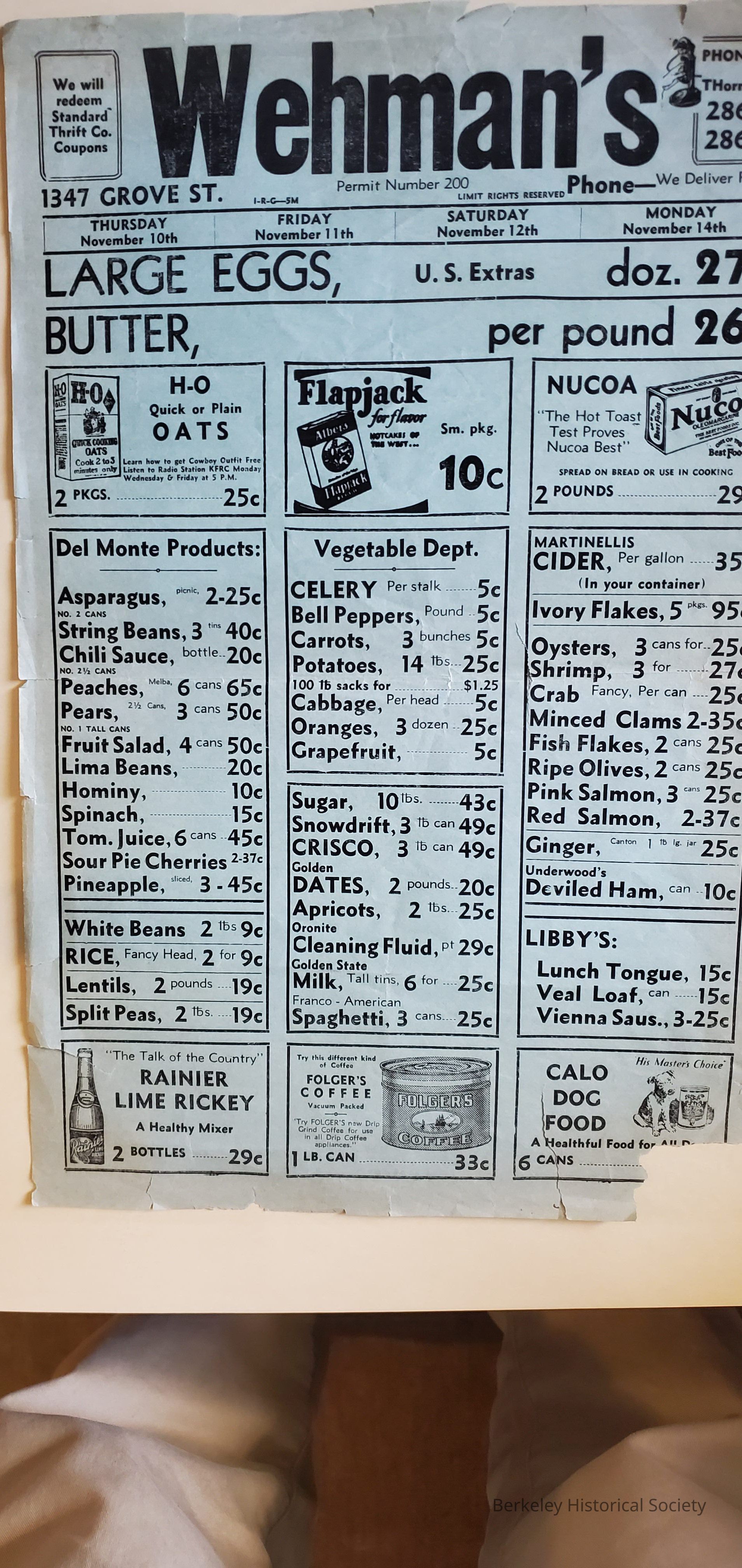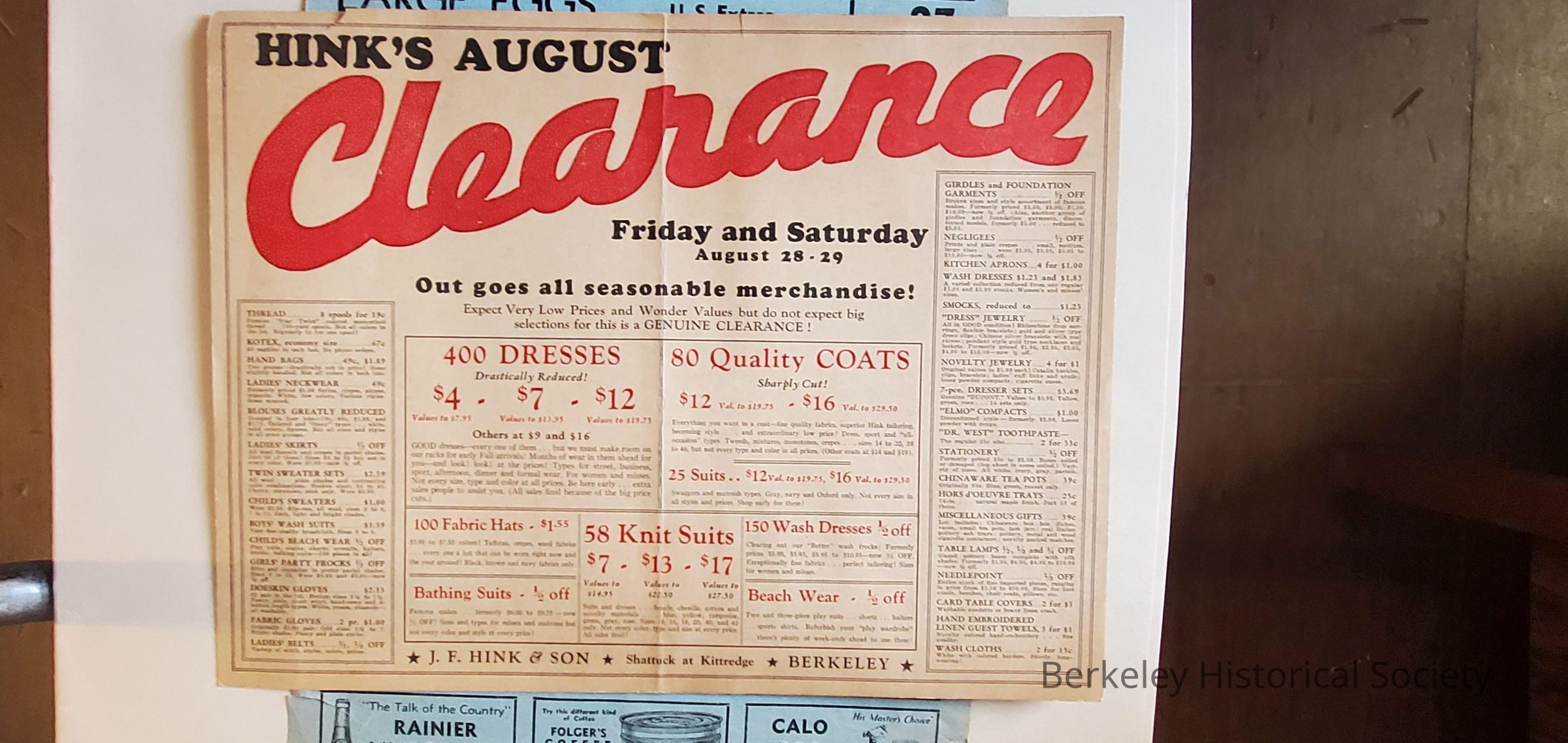 Large format advertising sheets: Wehman's Grocery: 2 items, one is November 1932 and the other April 1925 or April 1931; Hink's August Clearance August 1931., Troy Laundry undated.